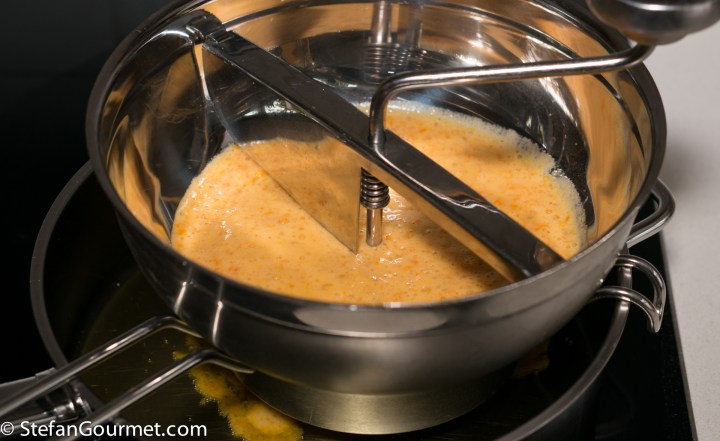 Push the pureed cherry tomatoes through a food mill. First through the coarse disc…
