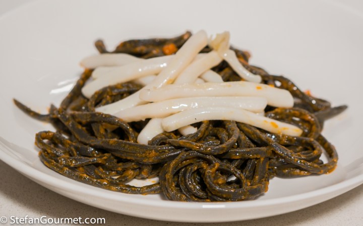 On the beautiful Golfo di Policastro in Basilicata, Southern Italy, we had a wonderful dinner by the sea at Cala del Citro in Maratea. One of the dishes was black tagliolini with raw squid, and this recipe was inspired by that. Since only frozen squid was available, I cooked the squid sous-vide instead. With hindsight I should be sliced the squid a bit more thinly, but otherwise this dish turned out great. The combination of flavors and textures works very well, and the colors are also very nice.