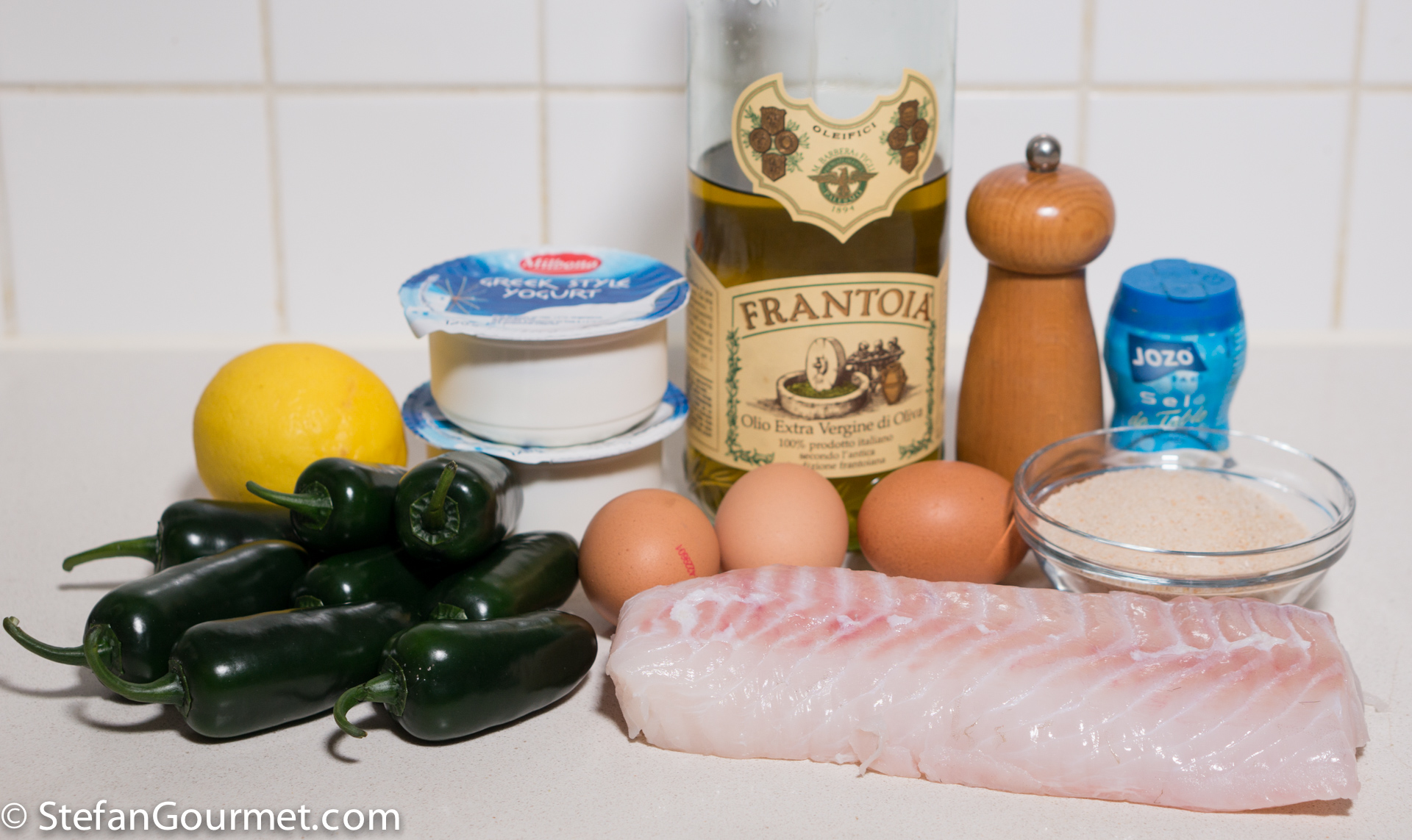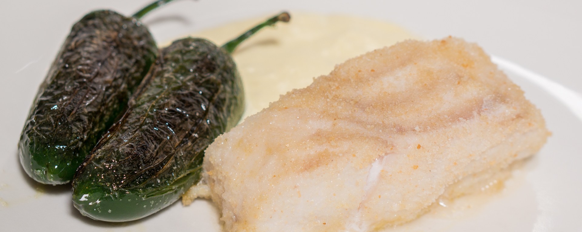 This dish was inspired by another dish we had at Don Alfonso. It could be made with any kind of white fish and any kind of green peppers, as mild or as hot as you like. The Italian green peppers that were used there were a bit milder than jalapeños. Pimientos de Padrón would also work. You can cook the fish in oven, or for more of a crust bread the cod and pan fry it. This dish has a lot of zing to it thanks to the peppers and the yogurt-lemon sauce. The technique for making a warm yogurt sauce is very nice.