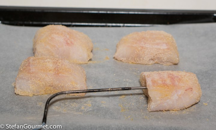 …and cover with breadcrumbs. Insert the probe of an instant-read thermometer into the center of one of the pieces of fish…