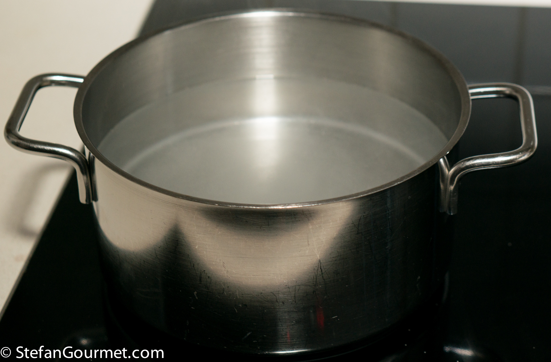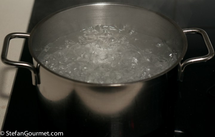 7:17pm Fill a pot with water and put it over high heat to bring it to a boil. Add about a tablespoon of salt and 1/4 teaspoon of baking soda.