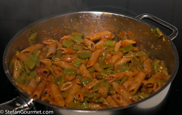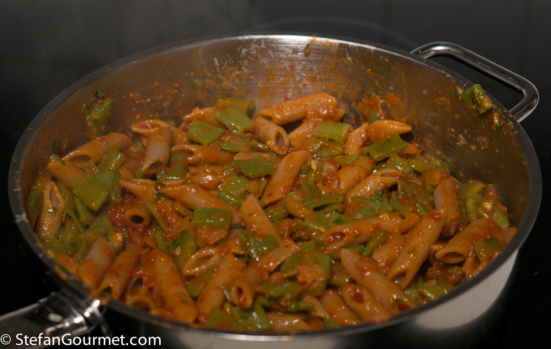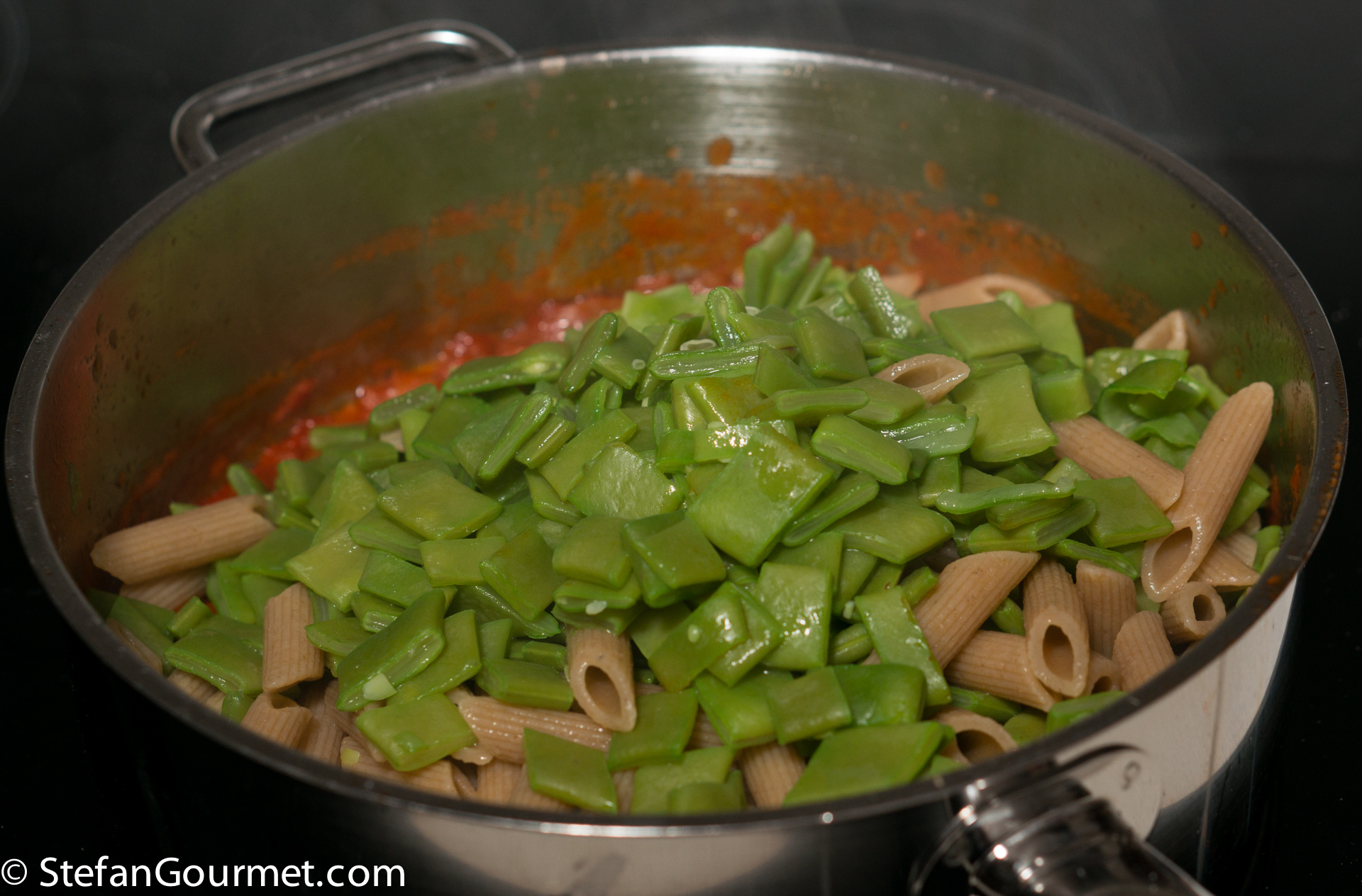 7:38pm Add the pasta and runner beans to the tomato sauce.