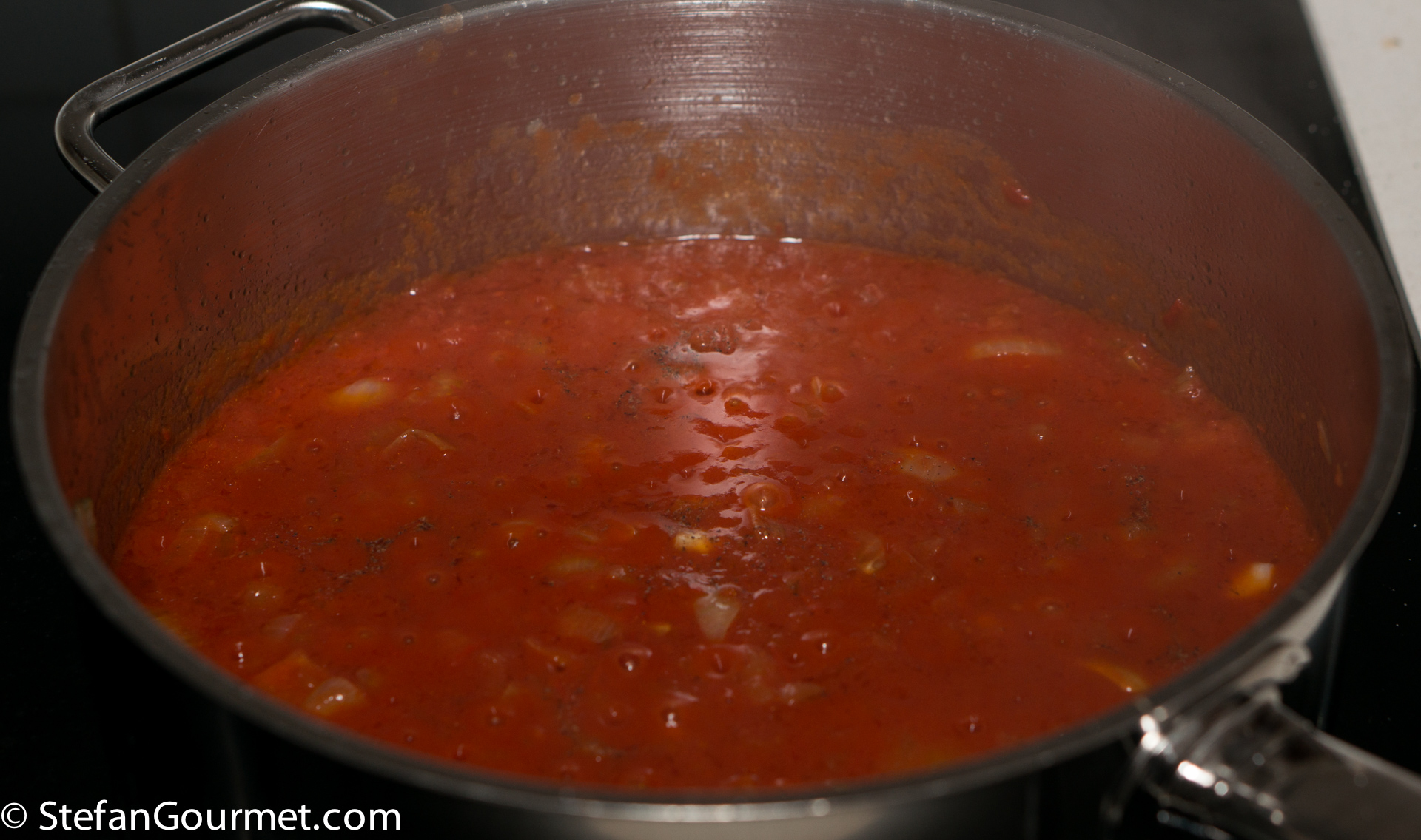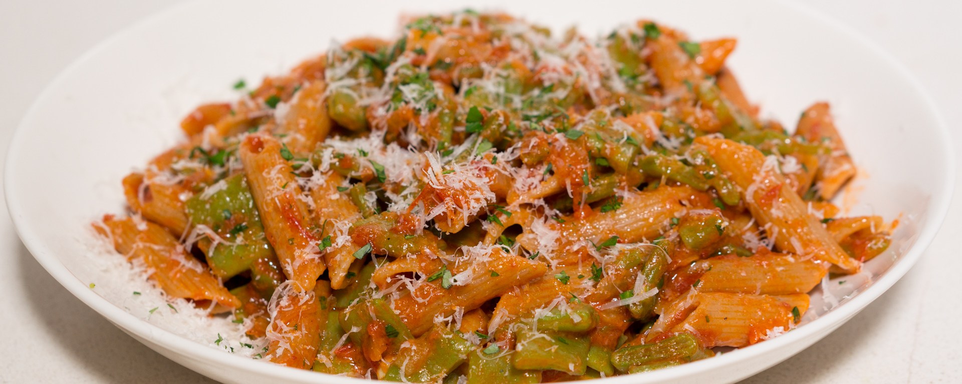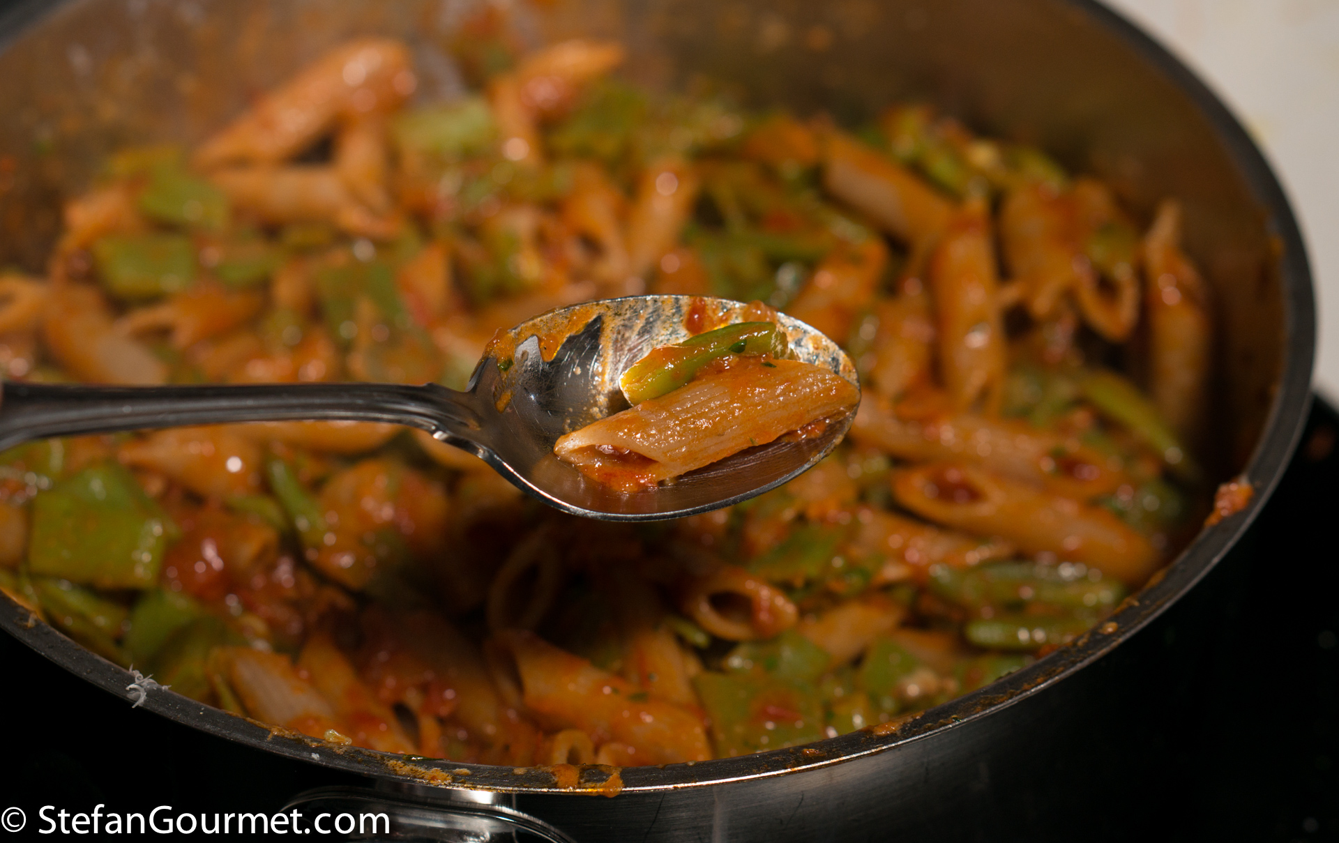 7:38pm Add the pasta and runner beans to the tomato sauce.