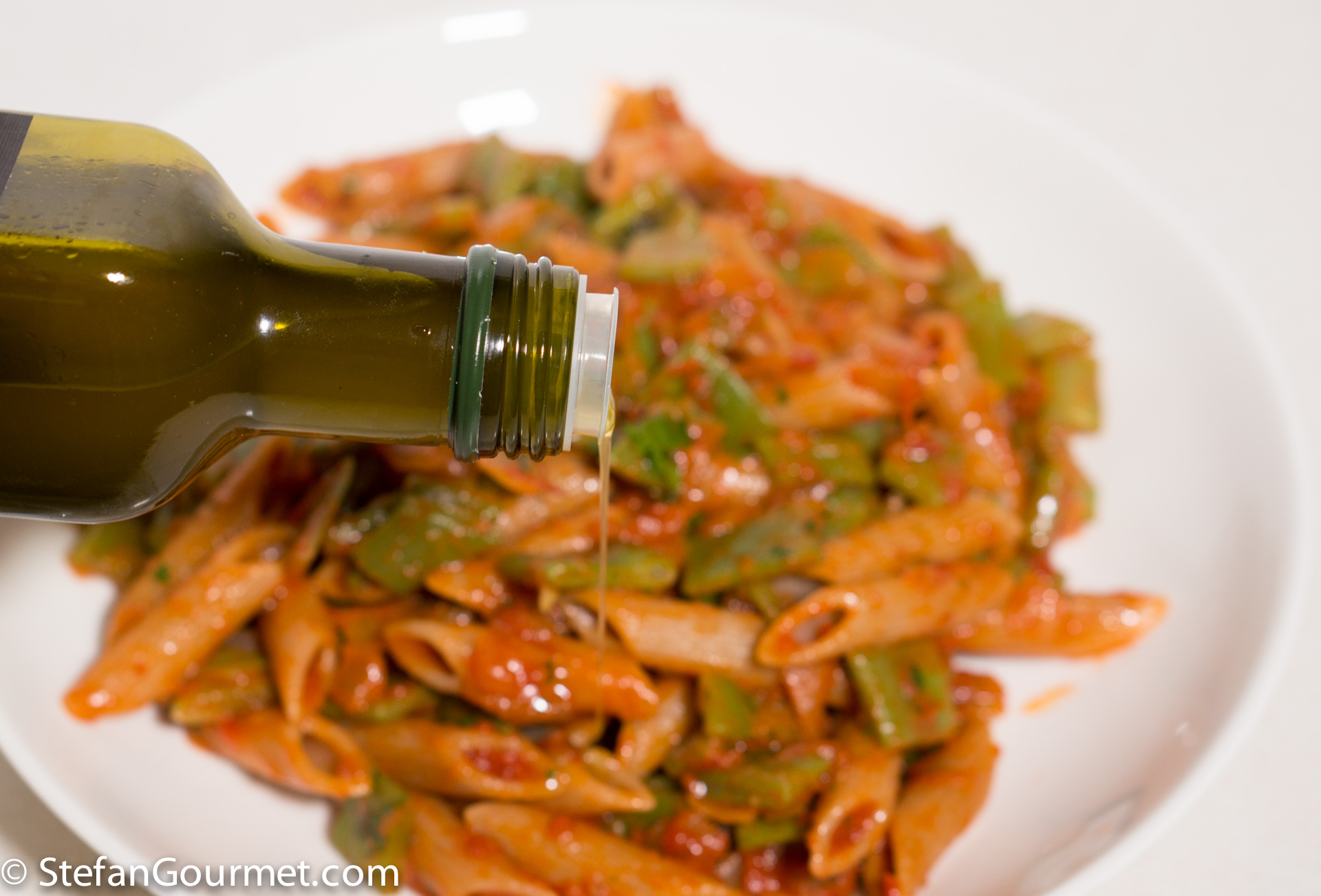 7:41pm Take the plates out of the oven and divide the pasta onto the plates. Drizzle with high quality extra virgin olive oil.