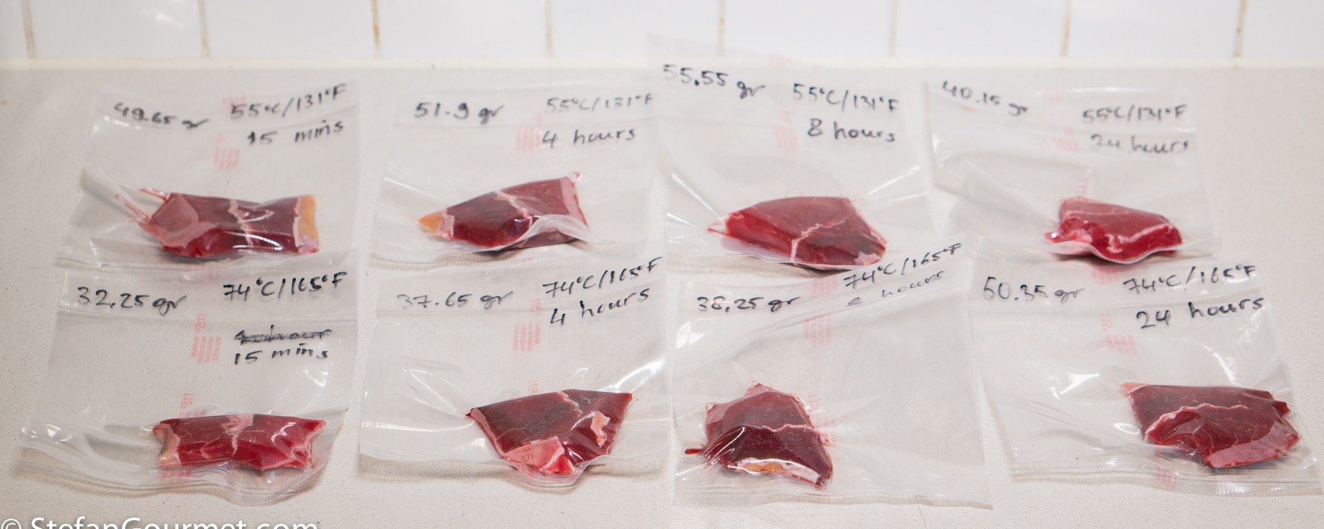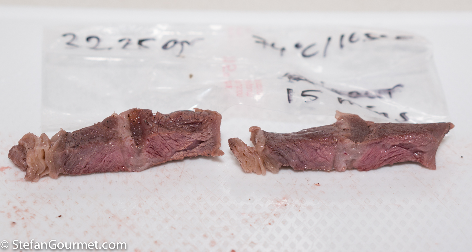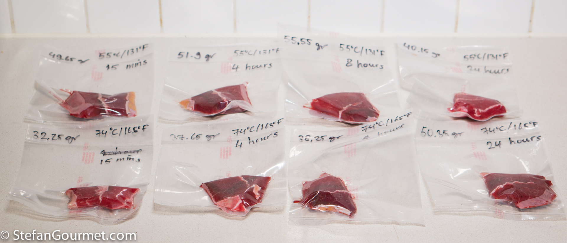 This photo shows all of the combinations I tried: for 15 minutes, 4 hours, 8 hours, and 24 hours, at both 55C/131F and 74C/165F. Since the blade steaks I used were only about 1 cm (1/2 inch) thick, 15 minutes is enough to take the core temperature of the steak within 1 degree of the water. All pieces were seasoned with salt and pepper before vacuum sealing, and weighed accurately. The loss of weight after cooking is an indication of how much water/juices are lost by the cooking process, although (especially at 74C/165F) the juices in the bag will also contain some fat that has rendered from the meat. For a fair comparison I did not sear the steak after cooking, but tried it straight out of the sous-vide. (I did pat all pieces dry with paper towels for an accurate measurement of the weight loss.)