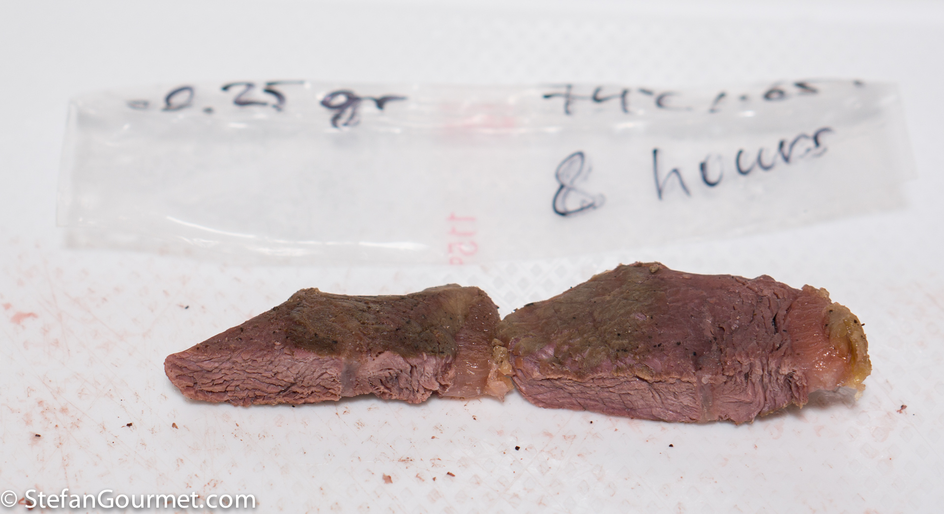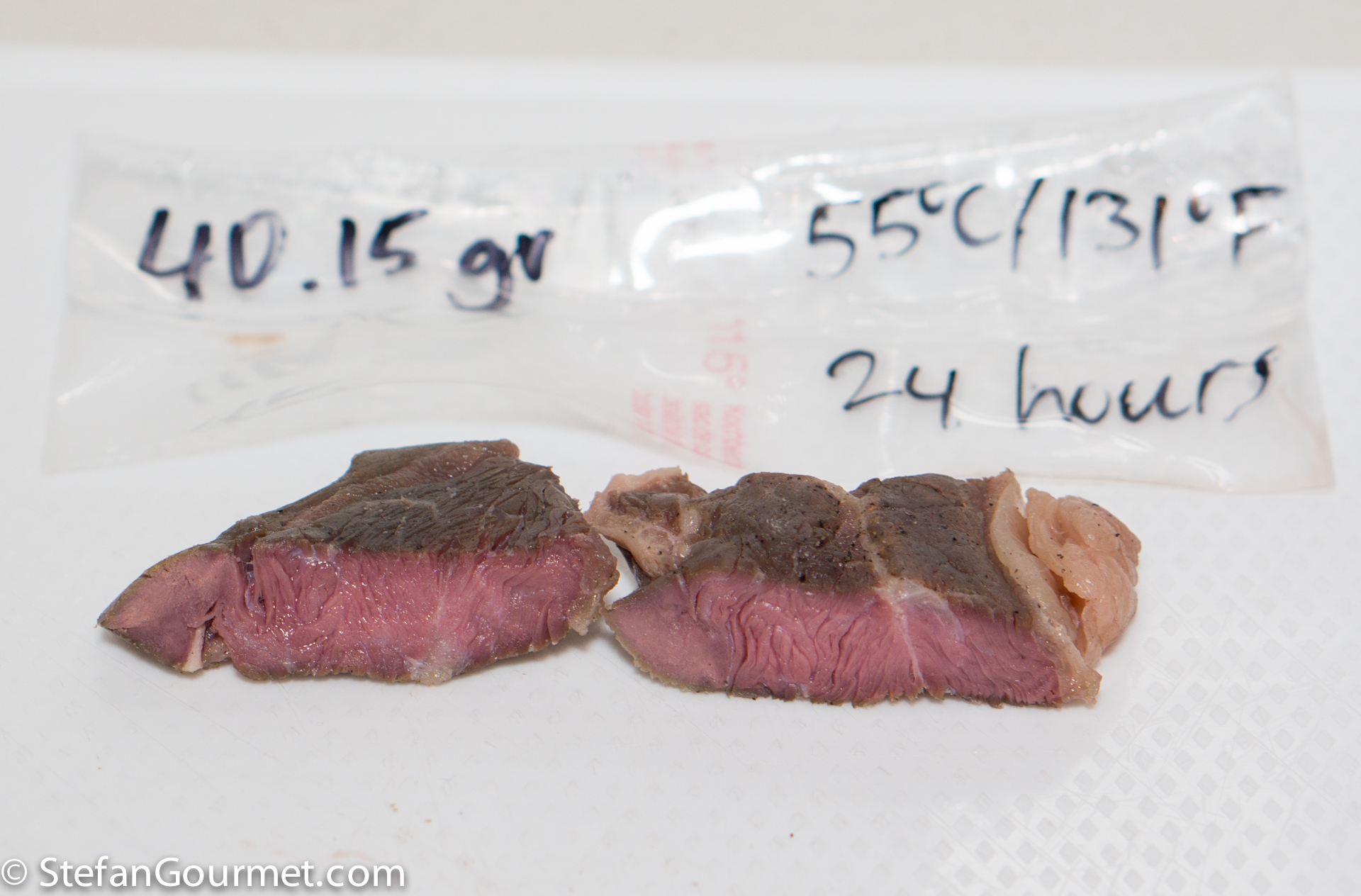 After 8 hours at 55C/131F the steak was again slightly less red, and slightly more tender than after 15 minutes or 4 hours. The weight loss was about 14%, but the difference in juiciness while tasting was ‘too close to call’. The connective tissue still very tough and not really edible.