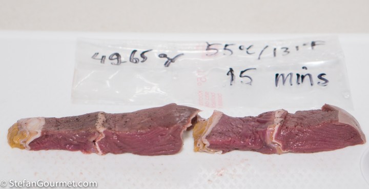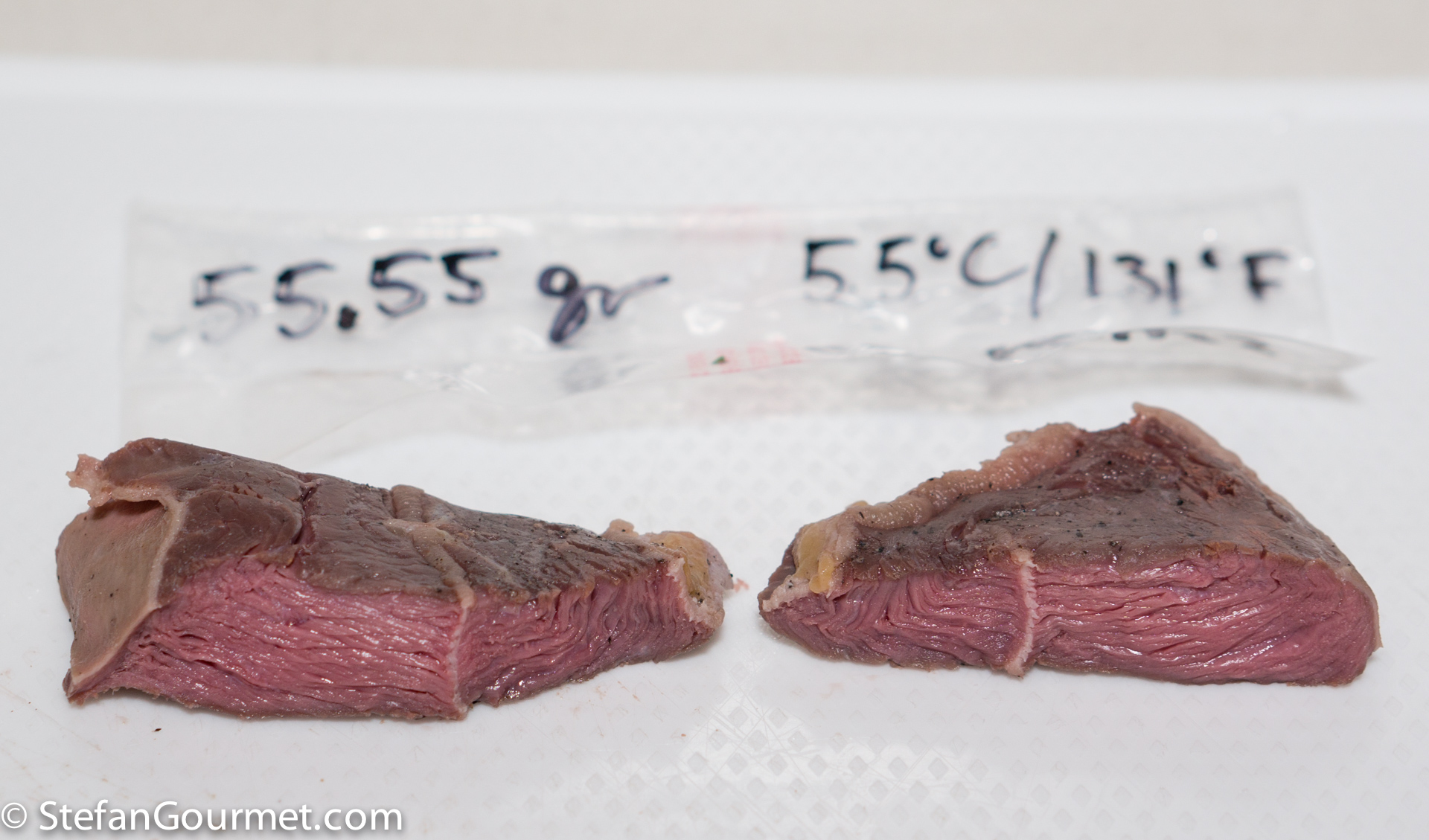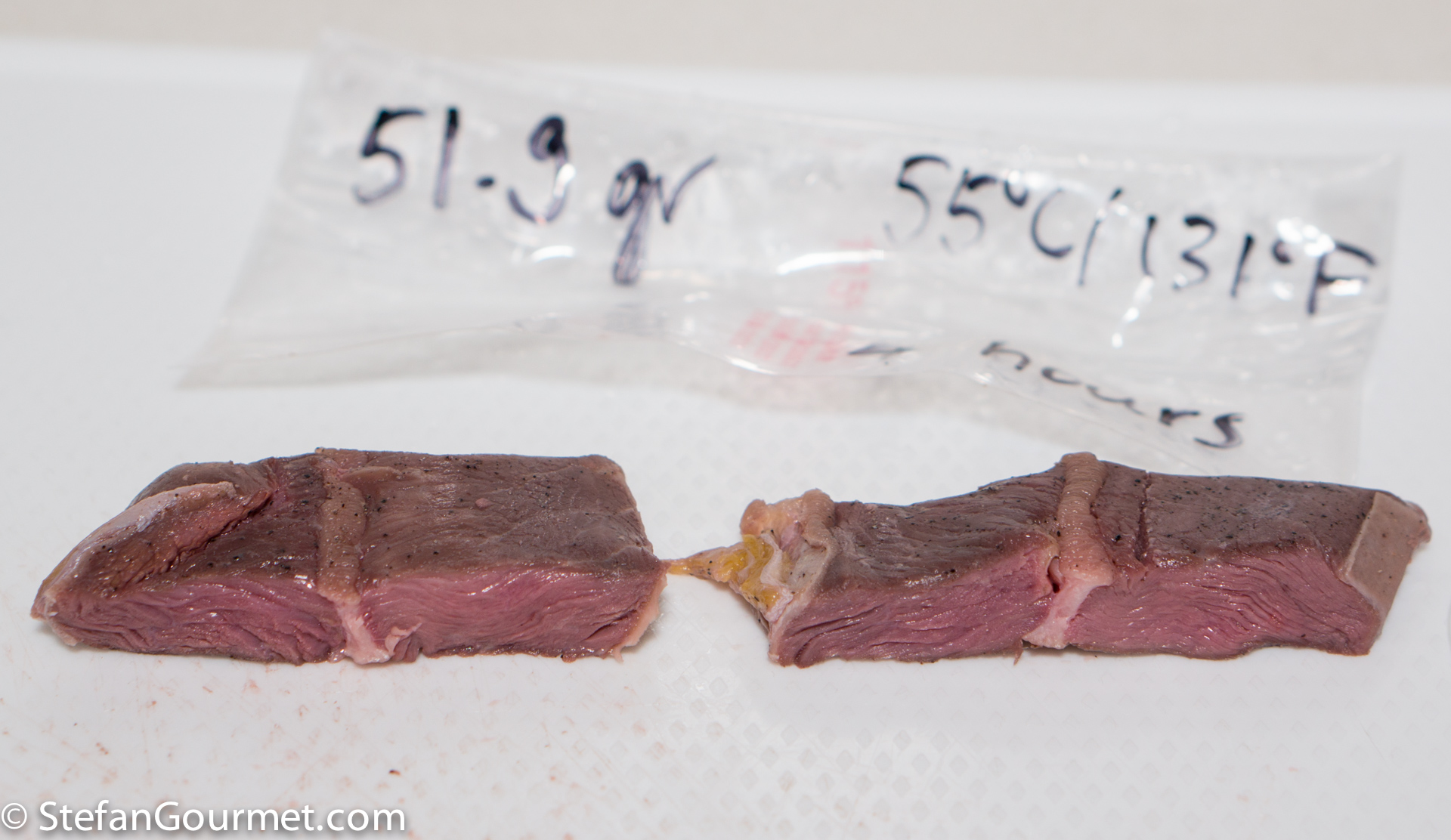 After 15 minutes at 55C/131F the steak was still a bit tough but certainly edible and tasted like medium rare steak. The connective tissue was very tough and not really edible, as it would take a much longer time than 15 minutes at 55C/131F to dissolve the collagen into gelatin. I was so hungry when I was doing this, that I had already eaten the meat before realizing I should have weighed it first.