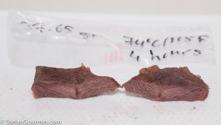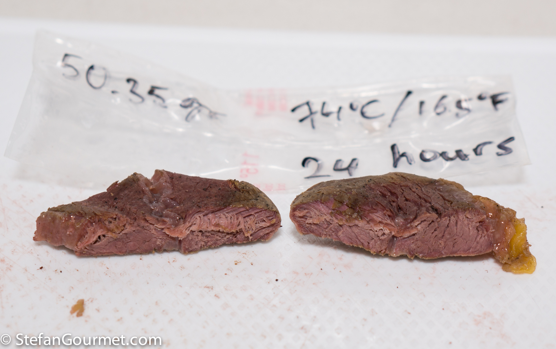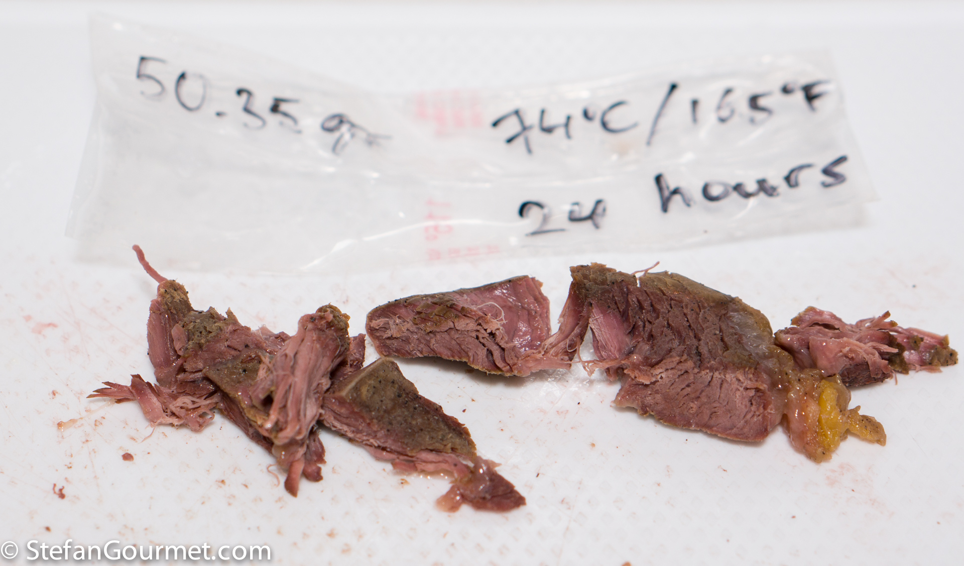 After 15 minutes at 74C/165F, the weight loss is already 26%, so that is a lot more than after even 24 hours at 55C/131F. As explained in this article, this is because above 57C/135F the collagen shrinks and squeezes water out of the meat. But more so than the dryness of the meat, what struck me when biting into this was how tough it was compared to the blade steak samples at 55C/131F, and especially the sample after the same 15 minutes at that temperature. As connective tissue is broken down more quickly at 74C/165F than at 55C/131F you may expect the meat to be more tender at the higher temperature. However, the fact that the high temperature instantly contracts the meat (just like meat will shrink when you put it in a hot pan) has a bigger toughening effect than what can be compensated for by the higher temperature in such a short time of only 15 minutes. Also the fascia inside is still very tough in this sample. It is also visible that the meat has less color, this is because myoglobin (that gives meat its red color) breaks down more quickly above 60C/140F.