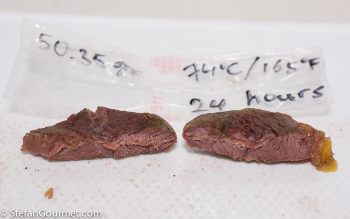 After 8 hours at 74C/165F, it is a bit more tender and has a bit less color, and it seems less dry even though the loss of weight is also 36%.