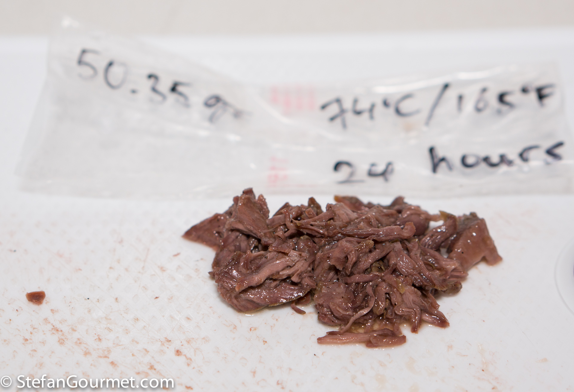 After 24 hours at 74C/165F, the meat is fall apart tender. You can now cut it with a spoon, and the fascia has its creamy quality.