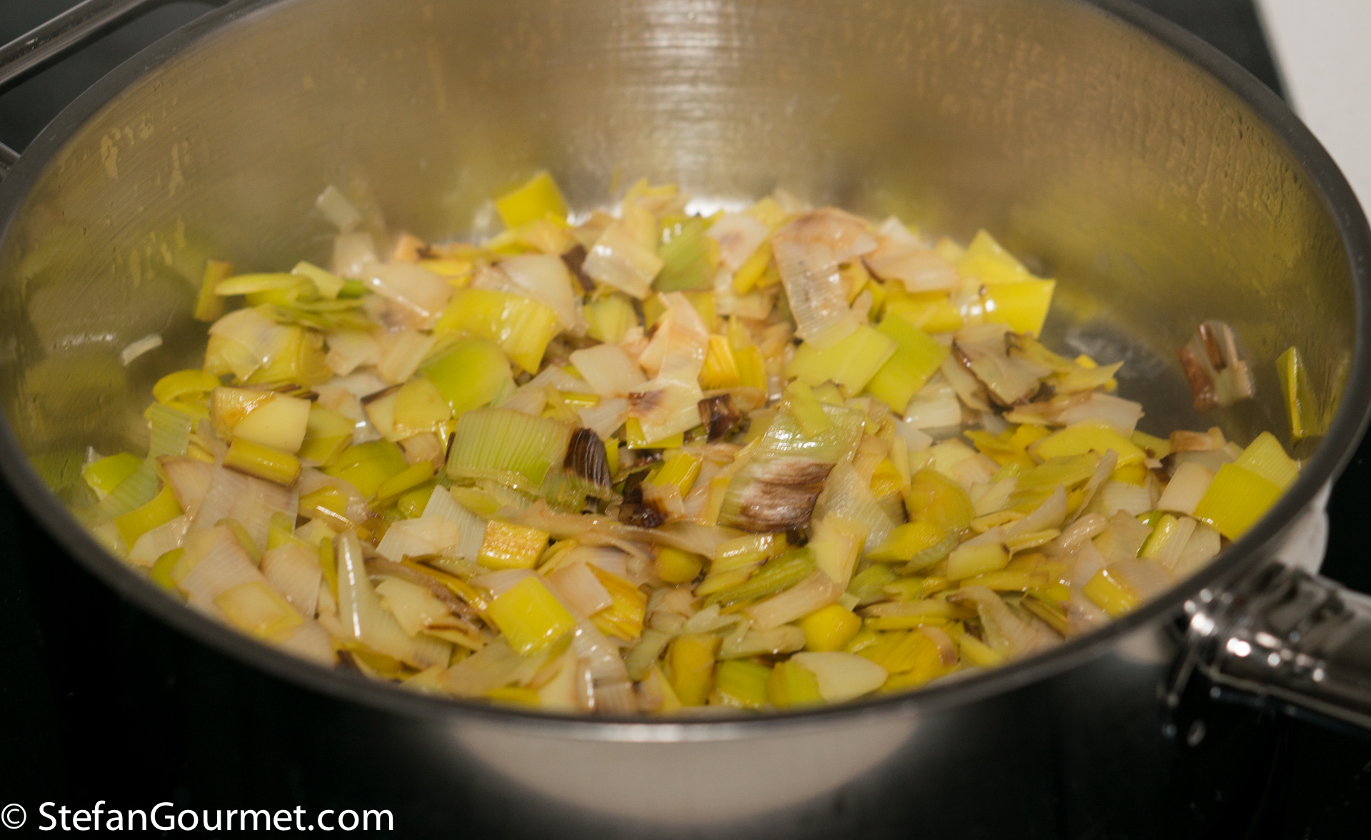 Use only the white and light green part of the leeks. Cut in half lengthwise and then into half rounds. Wash the leeks to make sure to remove all the sand.