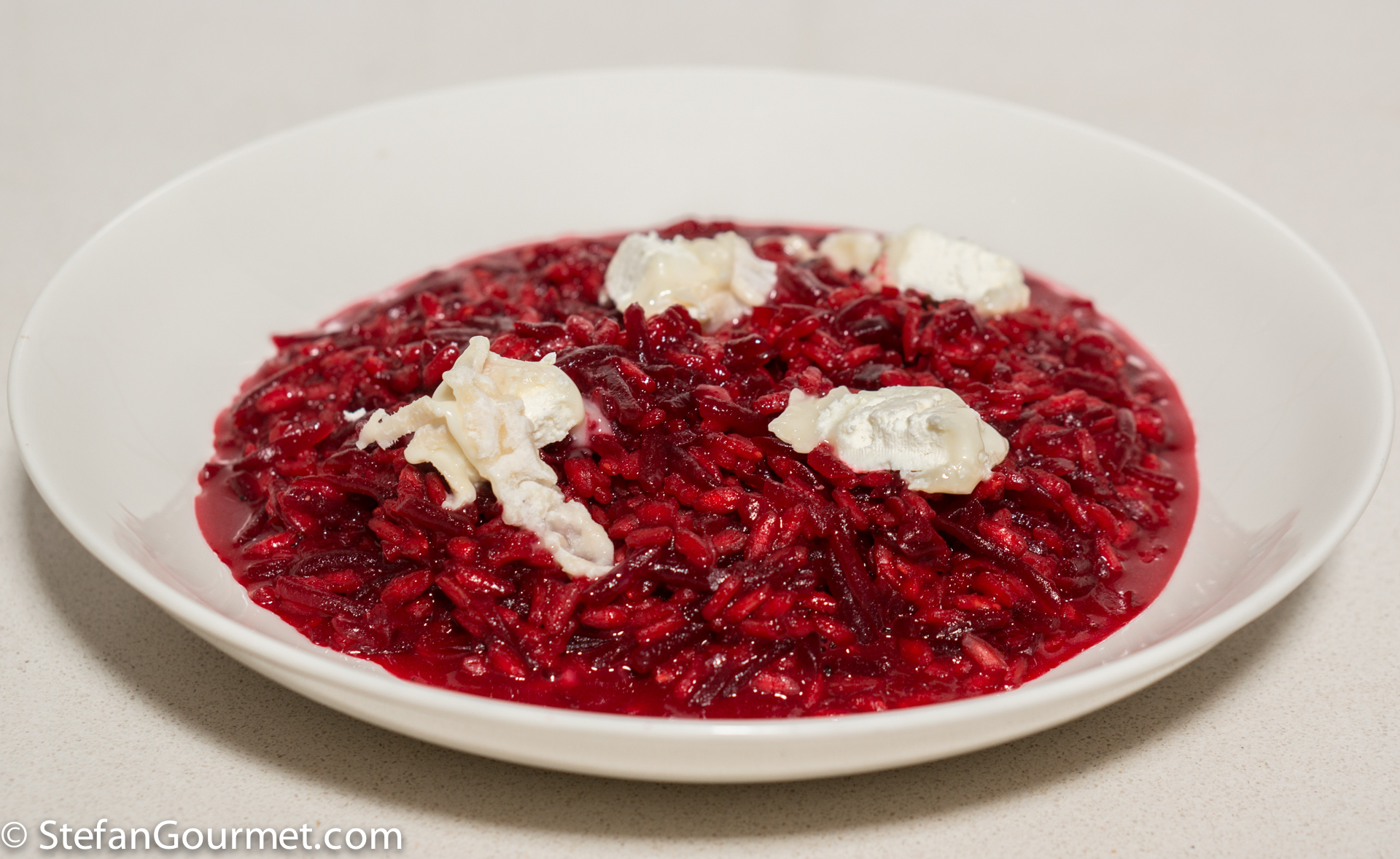 This beet risotto is made with the water that was used to cook the beets, and served with goat cheese.