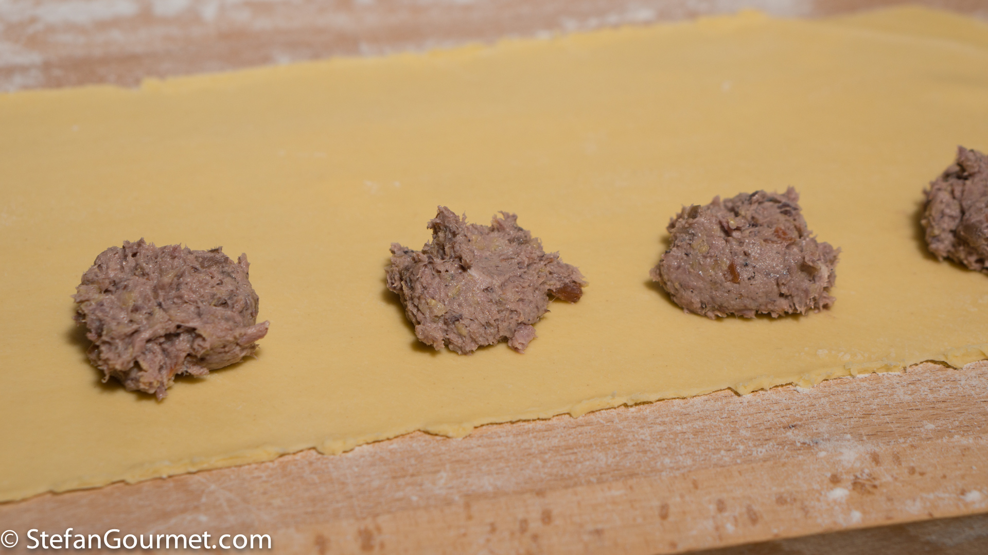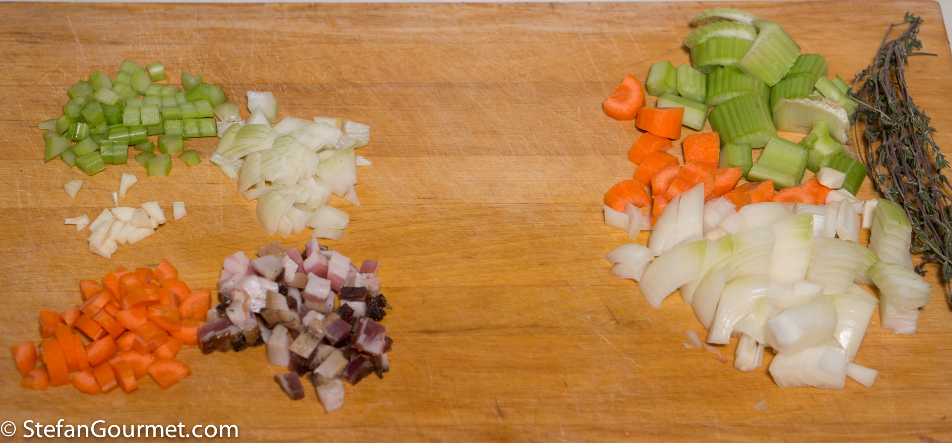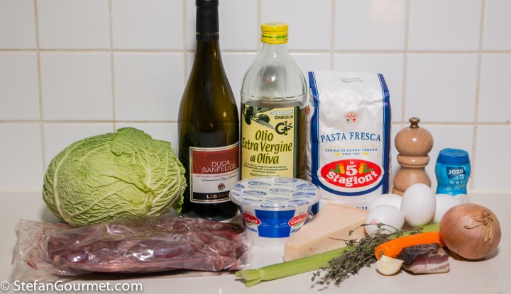 For the filling: 1 clove garlic, minced, 1/2 carrot, chopped, 1/2 celery, chopped, 1/2 onion, chopped, 40 grams pancetta, diced.