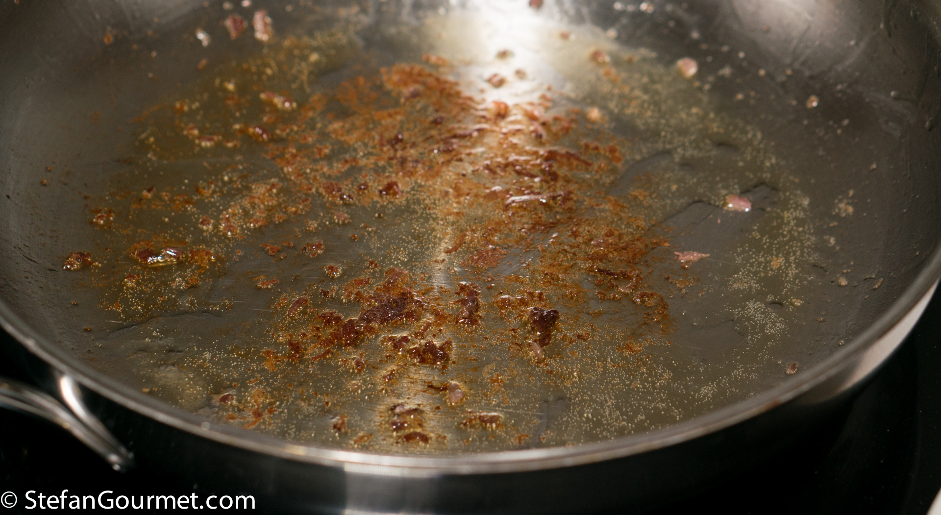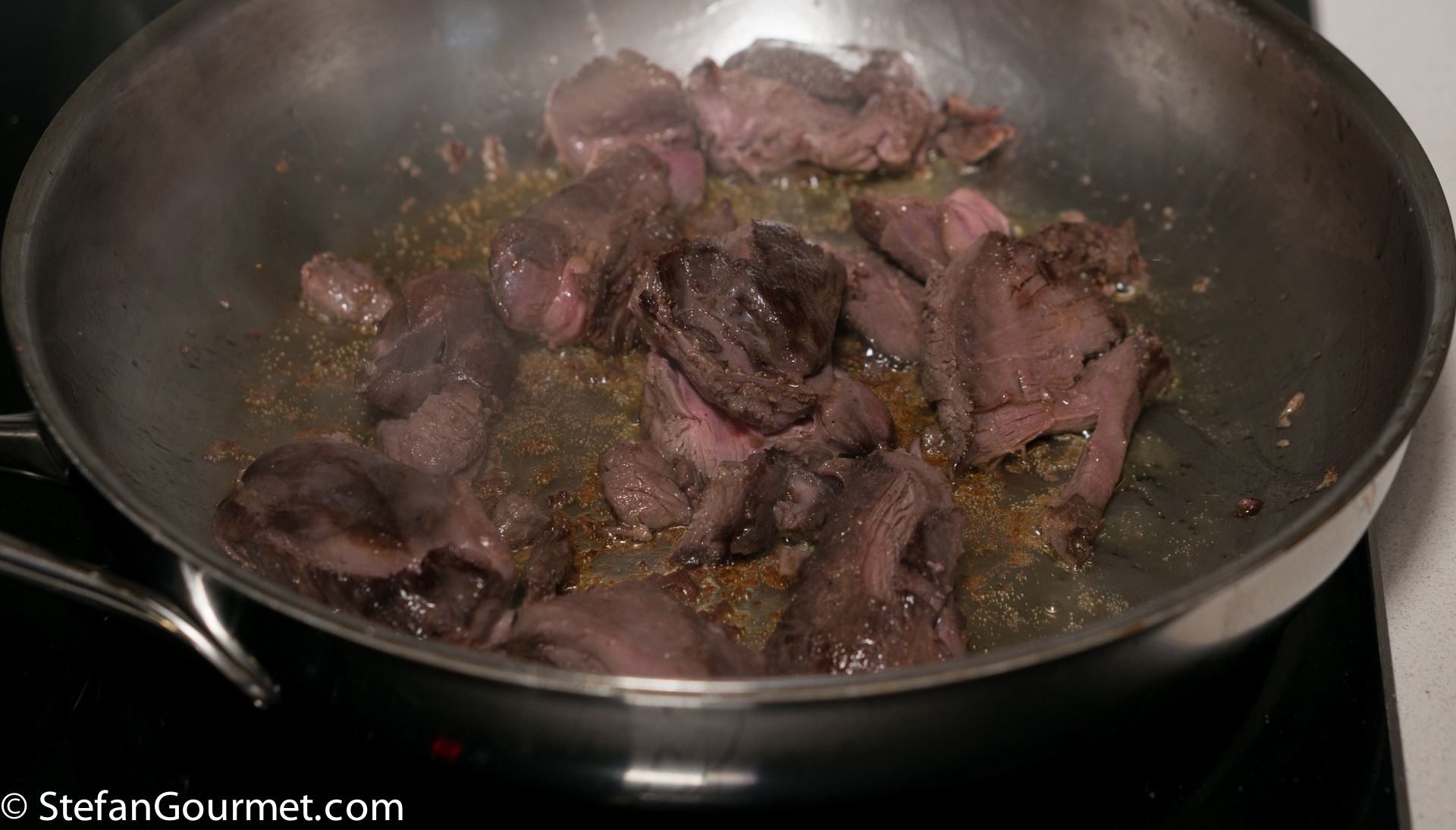 It it was still raw, cook over medium heat until the meat is barely cooked through, then take it out of the pan, and reserve.