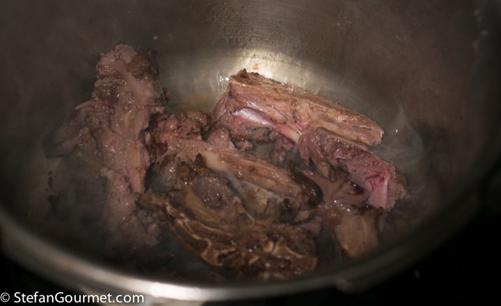 For the sauce, heat a tablespoon of olive oil in a stock pot or pressure cooker, and brown the bones over medium high heat.