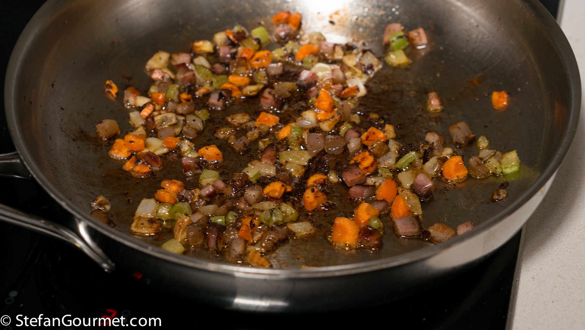Add the aromatics for the filling, and stir over medium heat until golden brown.