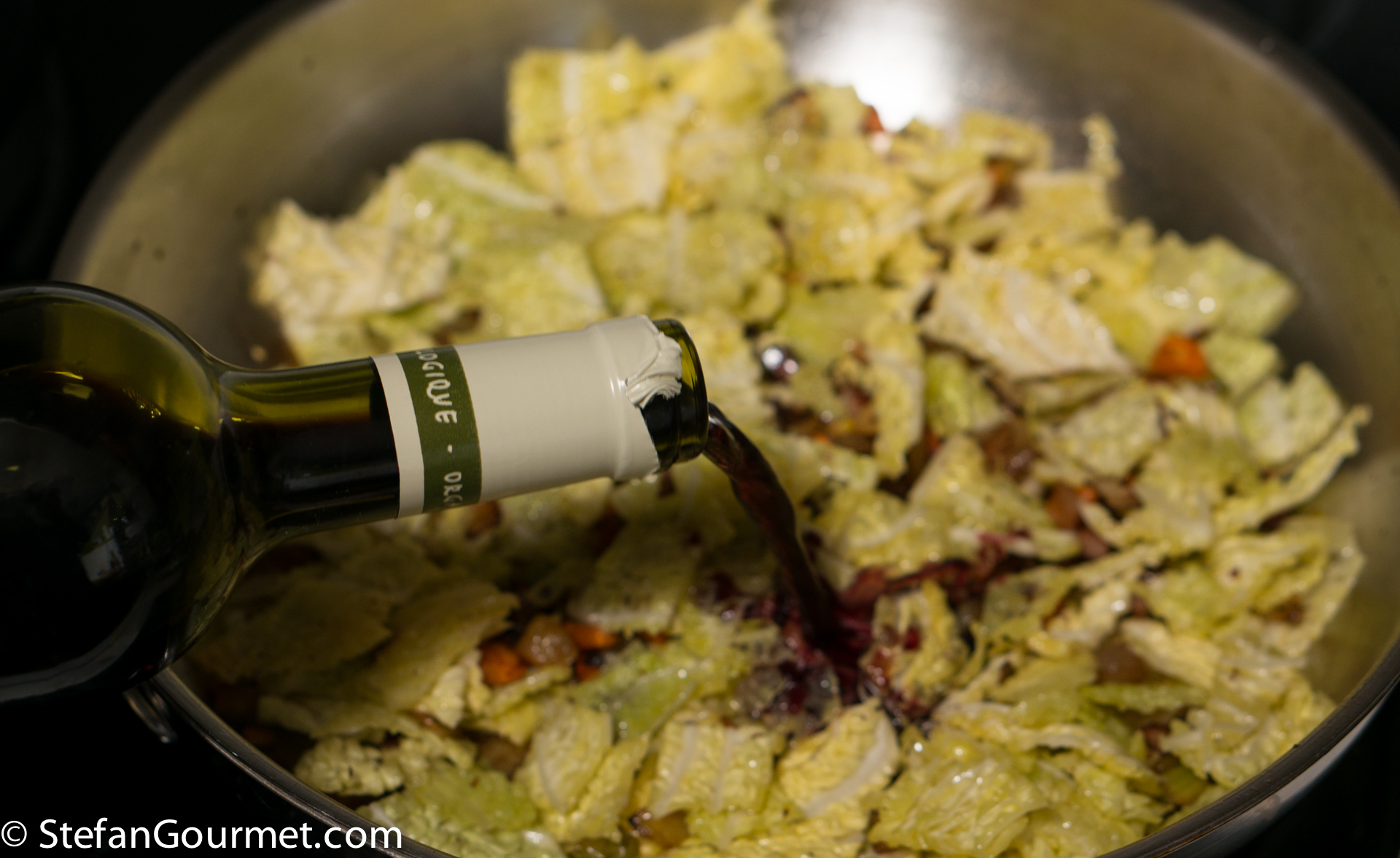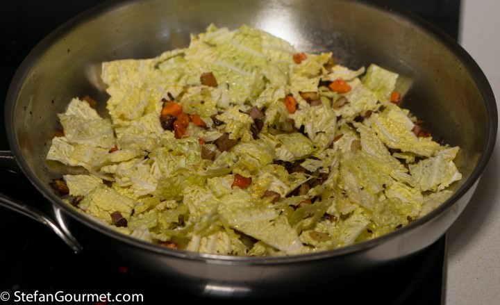 Add the shredded savoy cabbage, and stir until the cabbage is coated with the oil.