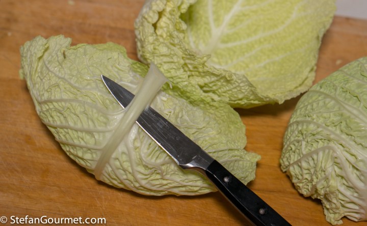 Take 1 cabbage leaf per serving and cut away most of the tough rib using a pairing knife.