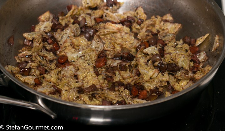 These hare and savoy cabbage ravioli are similar to agnolotti from Piemonte, which are also stuffed with a mixture of braised meat and greens. I had some left over hare, which had already been cooked sous-vide (2 hours at 60C/140F). I used the meat for the filling and the bones to make a sauce. The combination of hare and cabbage worked very well. Here’s what I did…