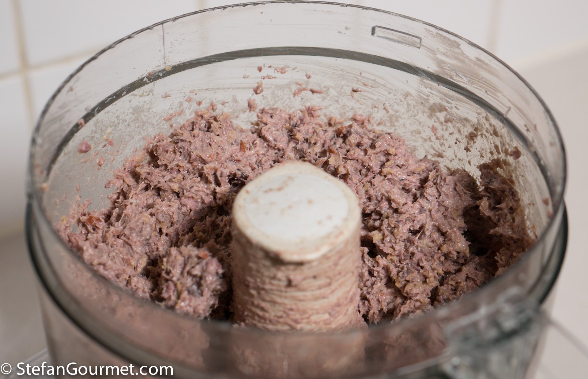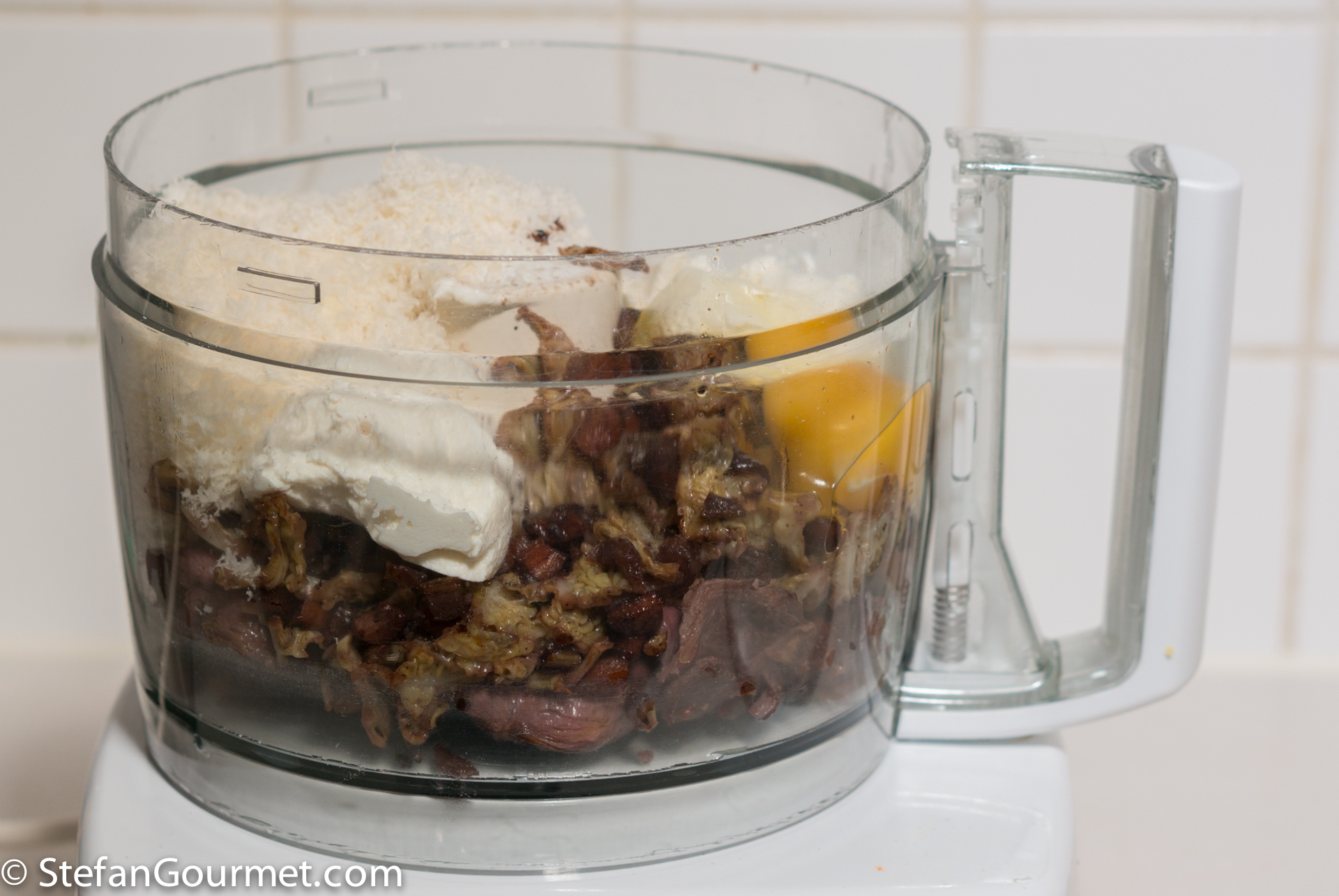 Chop the meat. Put it in the food processor, together with 125 grams of ricotta, 1 egg, 50 grams of parmigiano, and some freshly grated nutmeg.