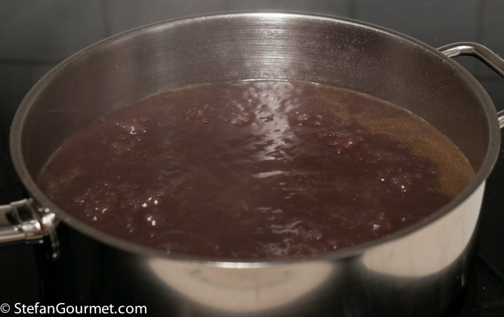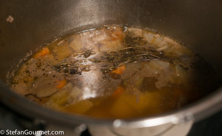 Add the aromatics for the sauce and cover with water. Bring to a boil and allow to simmer for 4 hours, or bring to pressure and pressure cook for 2 hours.