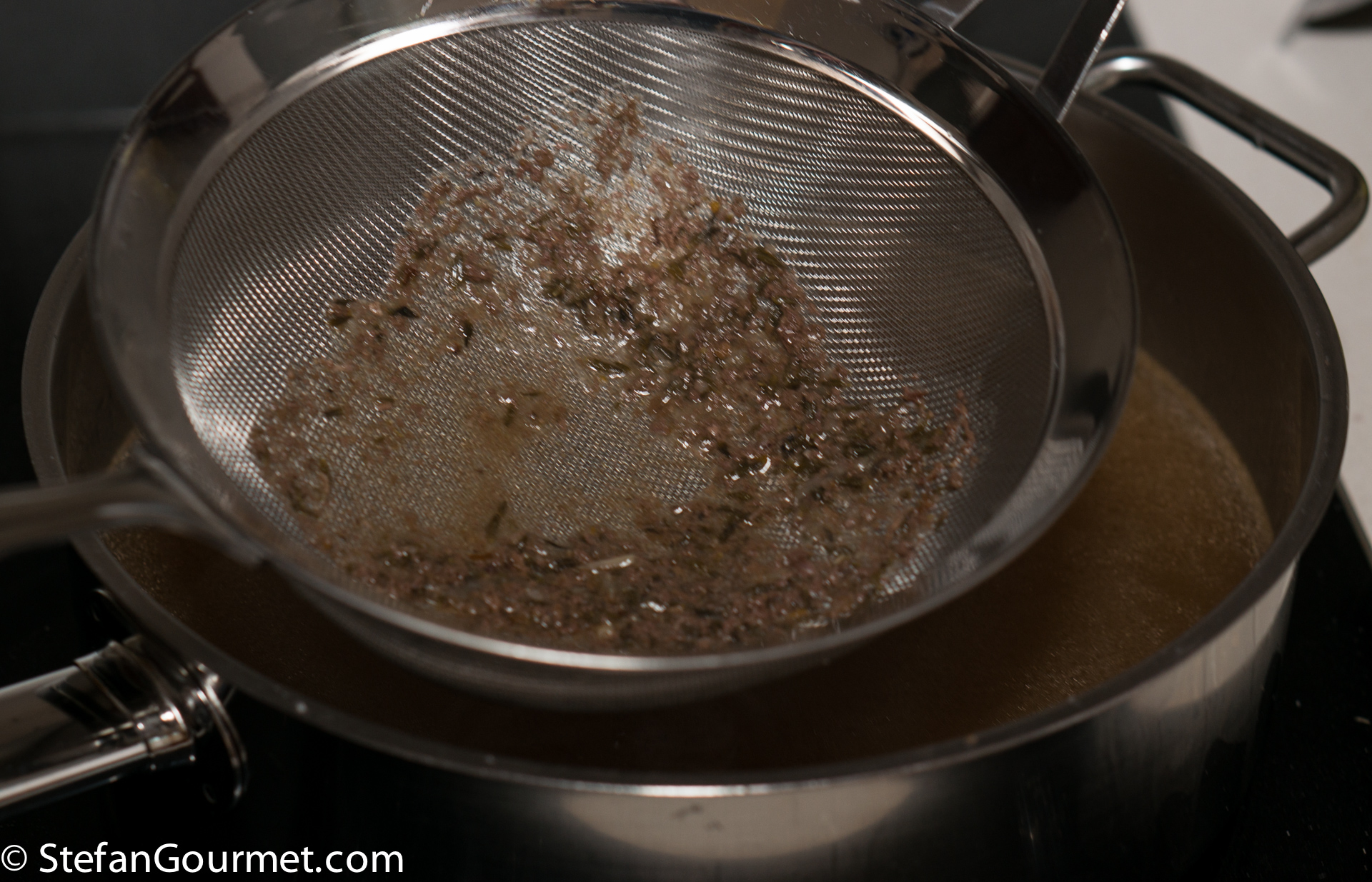 When the stock is done, filter it through a fine sieve into a wide shallow pan.