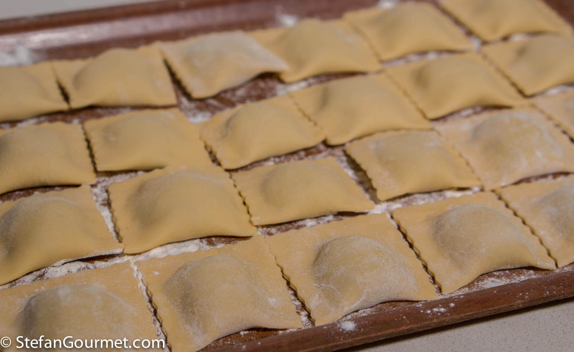 Make pasta dough using 4 eggs, and allow it to rest for at least half an hour. Roll it out to the thinnest setting and make ravioli following to my instructions.
