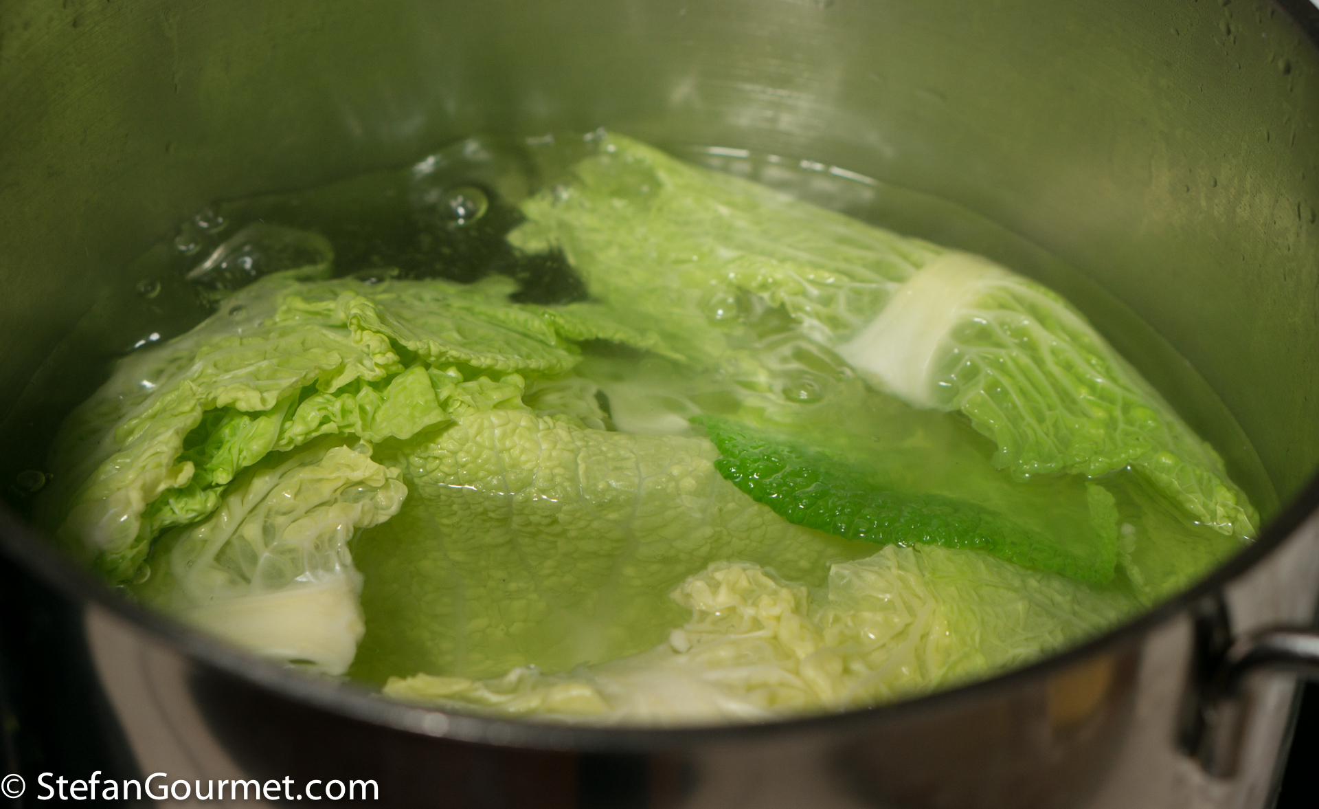 Bring a large pot of water to a boil. Add salt and the cabbage leaves, and boil them for about 3 minutes. Take the cabbage out of the water with a strainer, and reserve.