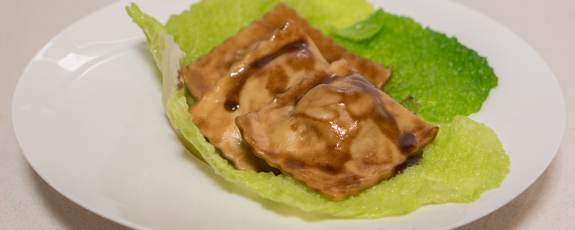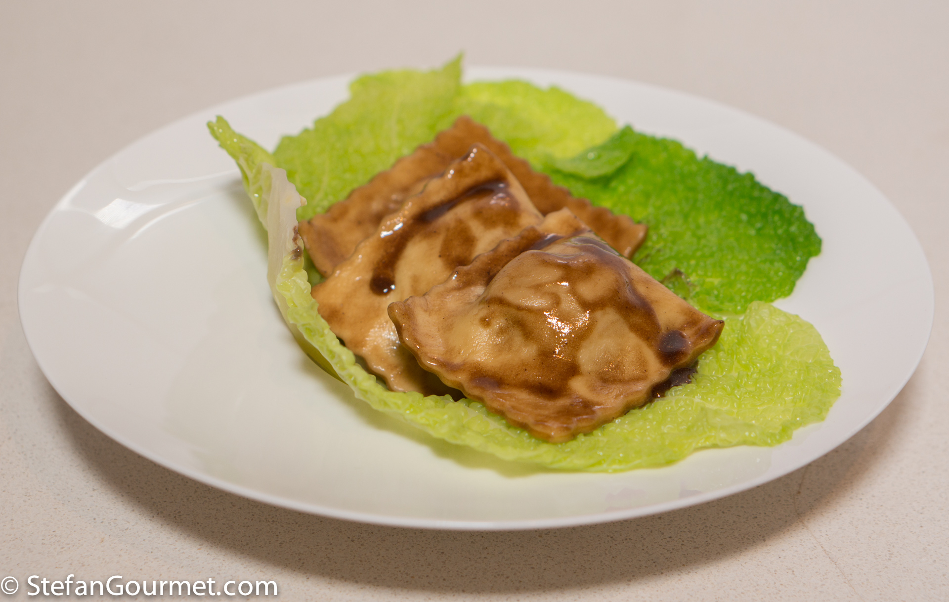 Serve the ravioli in a cabbage leaf on preheated plates, and grate a bit of parmigiano on top. Serve at once.