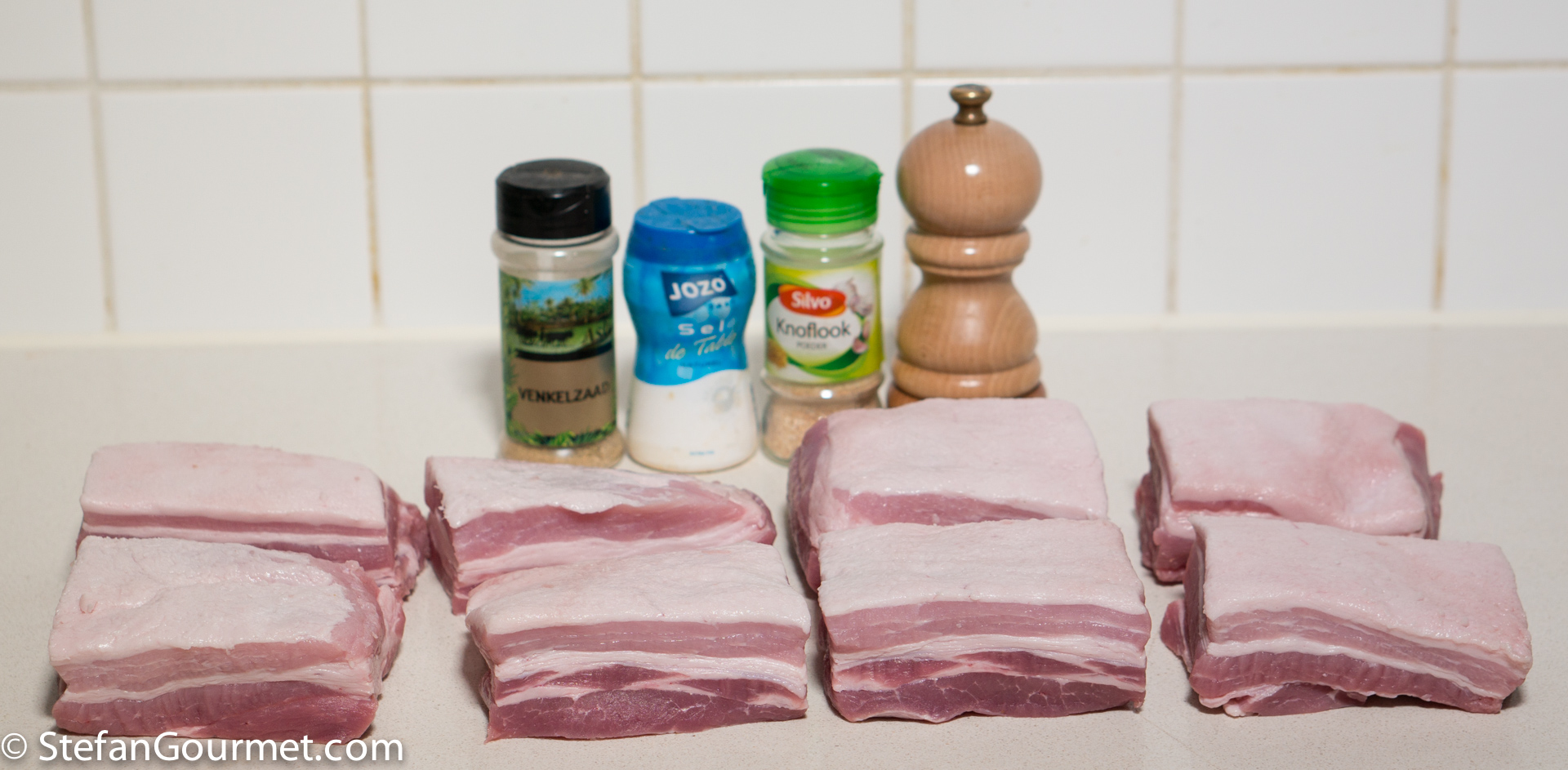 Here are the 8 pieces of pork belly with supporting ingredients. As you can see it was a relatively lean slab of pork belly, which makes it more prone to dryness.