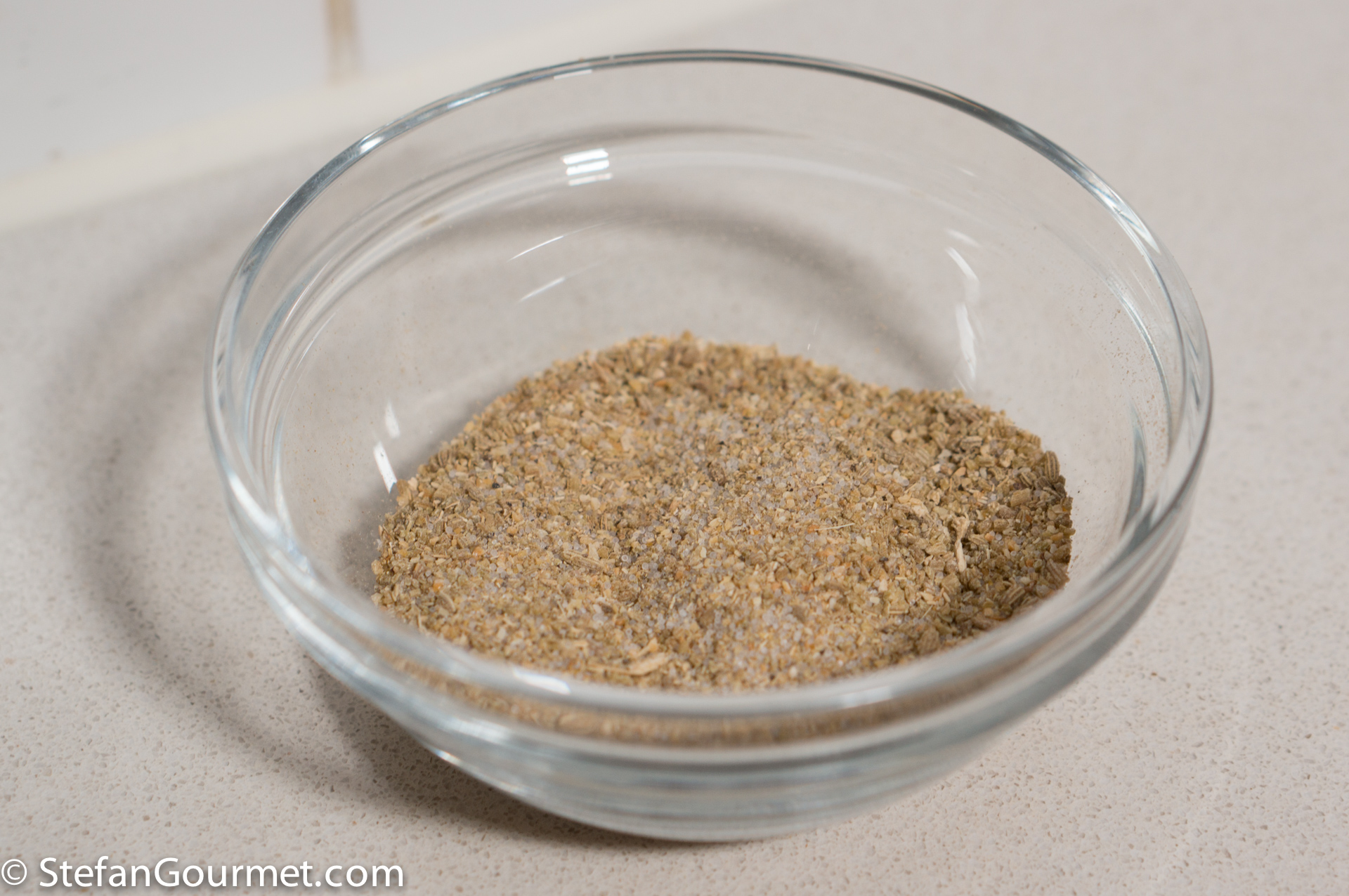 I mixed salt and spices in a small bowl, and spread this rub evenly on all sides of the pieces of pork belly.