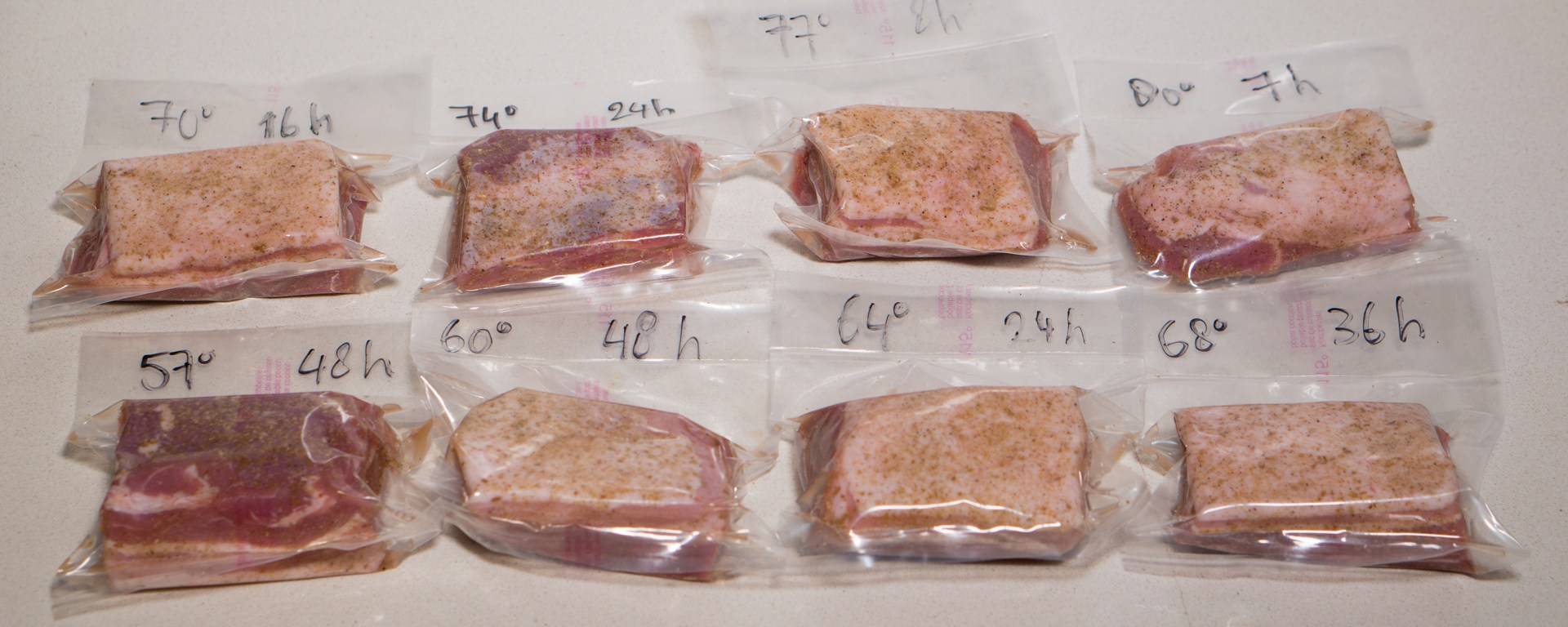 Then I vacuum sealed them and labeled them with the various time and temperature combinations I wanted to try.