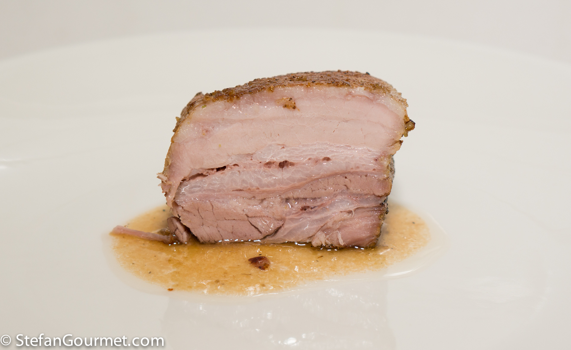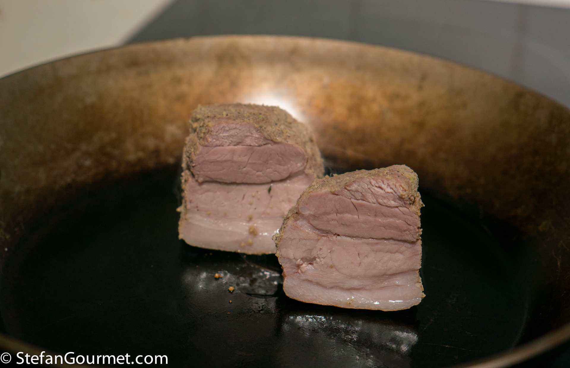 After cooking sous-vide, I seared the pork belly in a very hot frying pan with just a bit of oil.