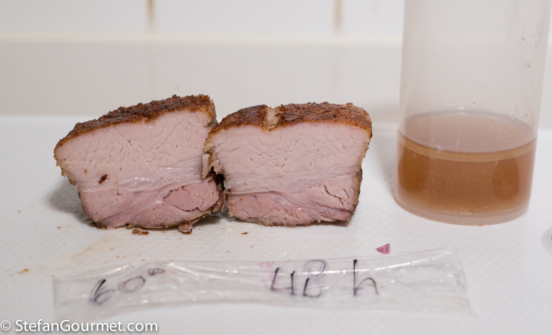 57C/135F for 48 hours. Very good: tender and juicy. As you can see only a bit of the fat has rendered (it floats on top of the juices). 8.5/10
