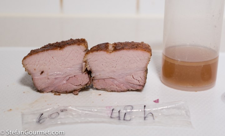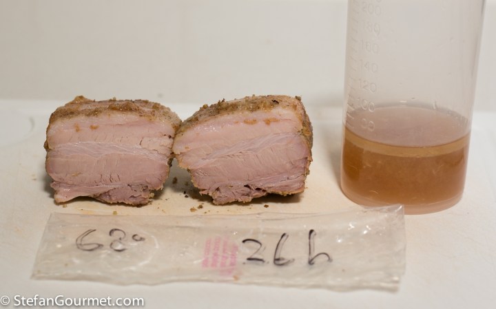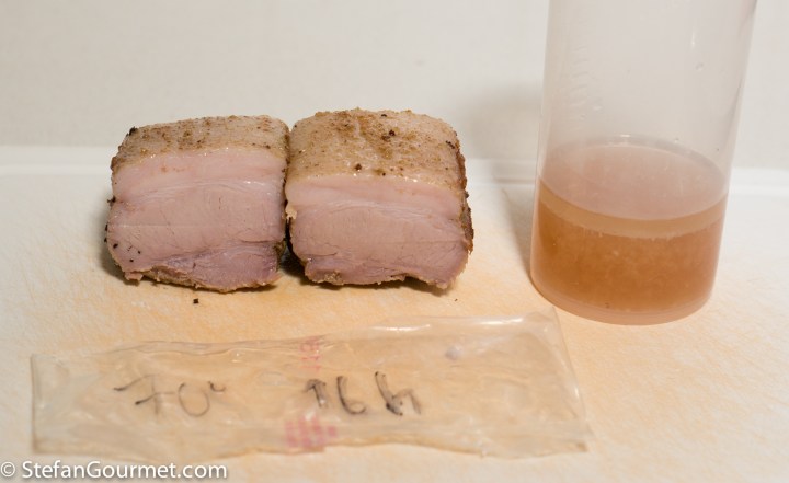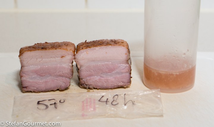 Although I would have to try more combinations of time and temperature to be absolutely certain about the ‘ultimate’ combination of time and temperature for pork belly sous vide, it is clear that a longer cooking time provides a better result. Just like I showed in this post, the dryness caused by a higher temperature can be offset by the additional tenderness from a longer cooking time. I expect that at 70C/158F, 77C/170F or 80C/176F better results would have been achieved with a longer cooking time. It also seems that temperatures between 60C/140F and 70C/158F are suboptimal; as my best results were 48 hours at 57C/135F and 24 hours at 74C/165F. Which of those you prefer is a matter of preference: at 57C/135F less fat will have rendered (which you can consider an advantage or a disadvantage) and the meat is not as flaky than at 74C/165F.