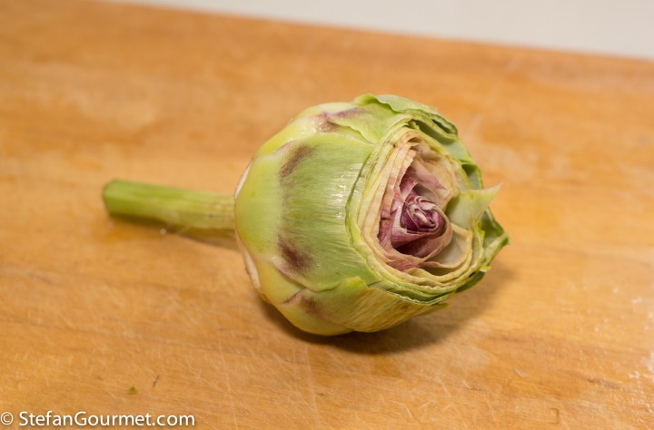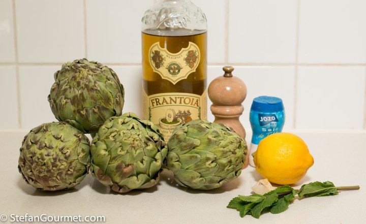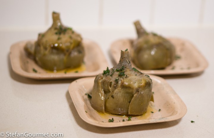 If you go to a trattoria in Rome, chances are that you will find carciofi alla romana on the menu. This way of preparing artichokes is quite simple, but very good. The mint and garlic add a nice fragrance to the artichokes. Most of the work is in cleaning the artichokes.