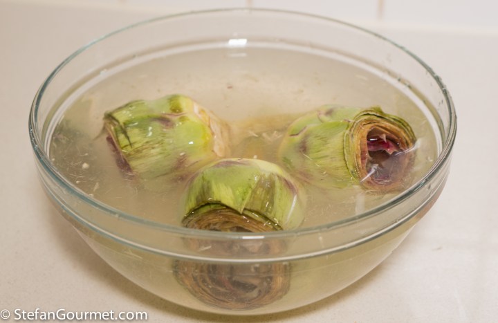 Keep the artichokes in a large bowl of water in which you have squeezed half a lemon to prevent discoloration.
