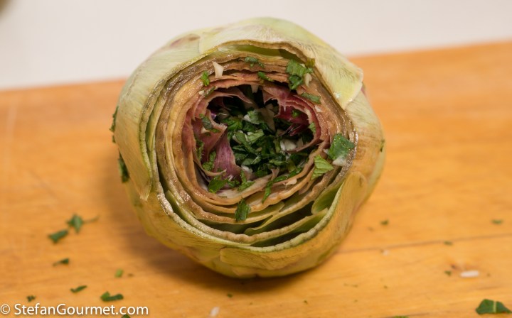 …and place that mixture inside the artichokes. Season the inside and outside with salt and freshly ground black pepper.