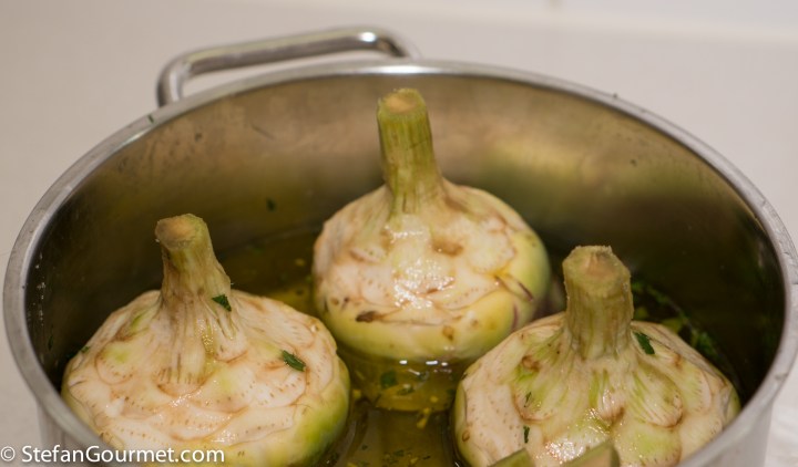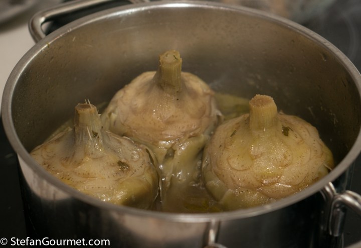 Arrange the artichokes, stem side up, in a pot in which they fit snugly. Add water (best is if you fill up to the stem, but they have to fit really snugly as otherwise they will float and roll over) and a generous amount of olive oil.