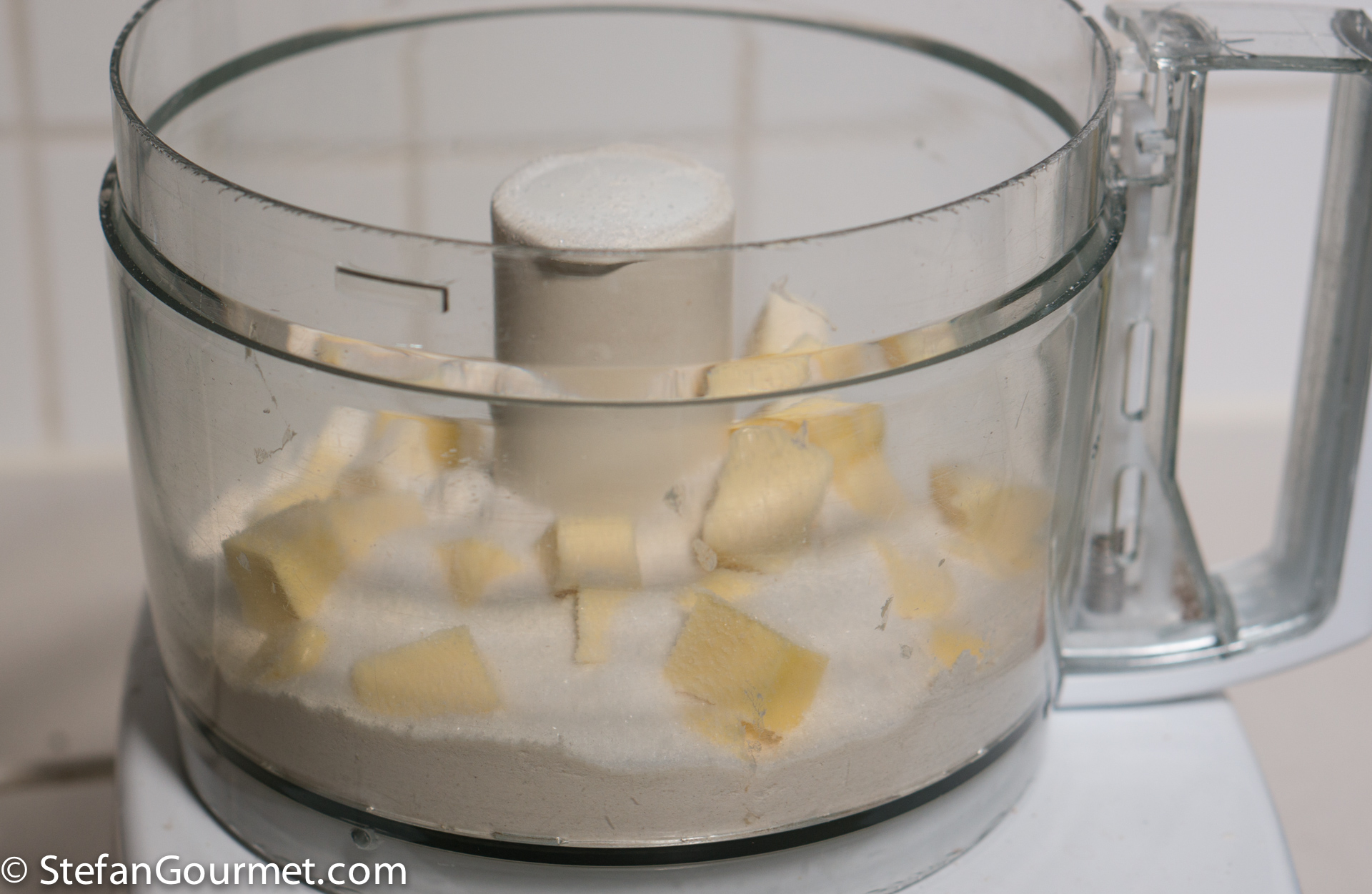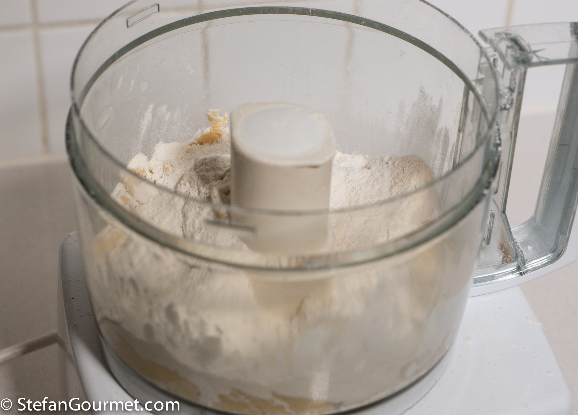 Combine 130 grams flour (that is 2/3 of the flour) with 1 teaspoon salt and 2 tablespoons sugar in the bowl of the food processor, and pulse a couple of times to mix.