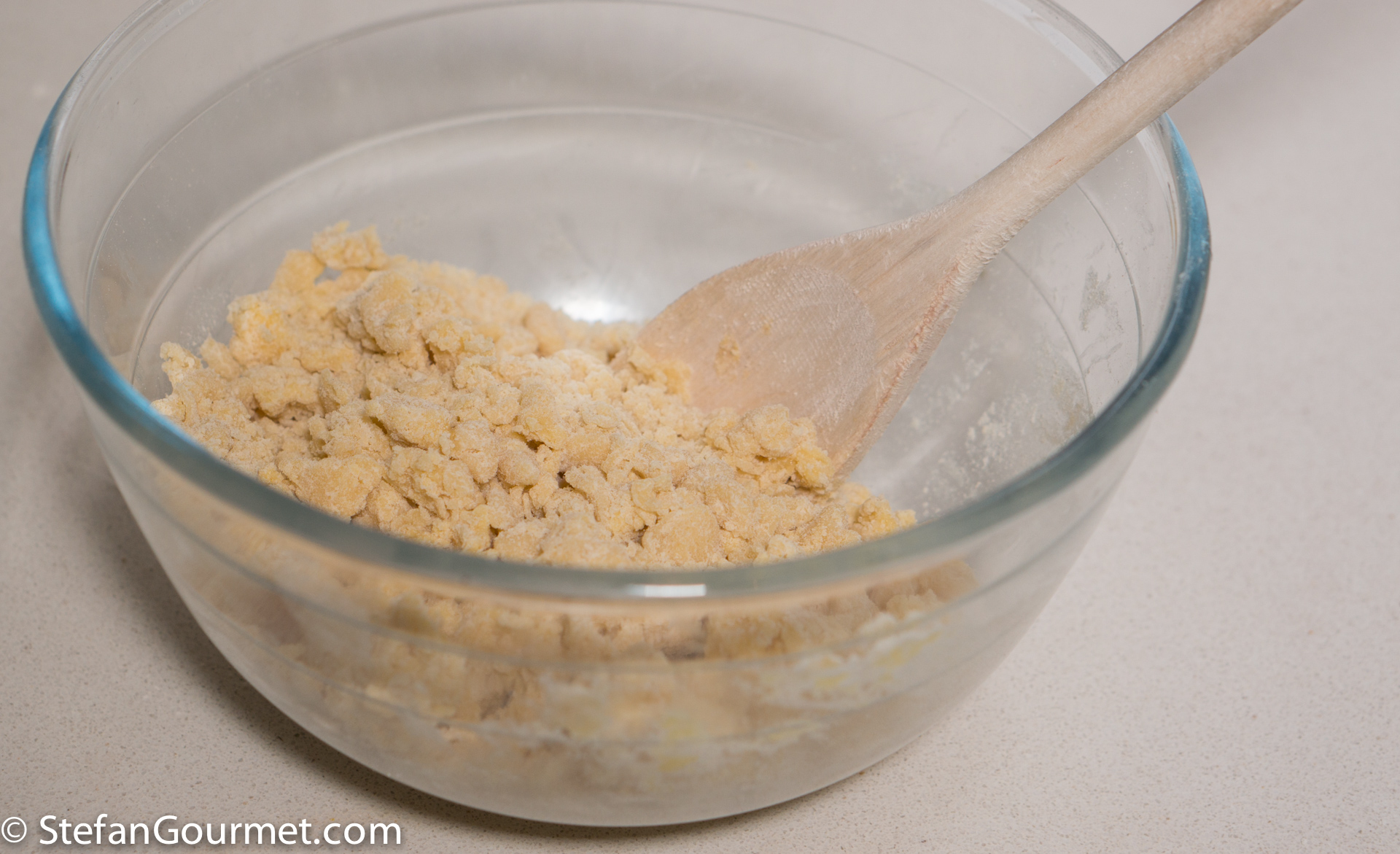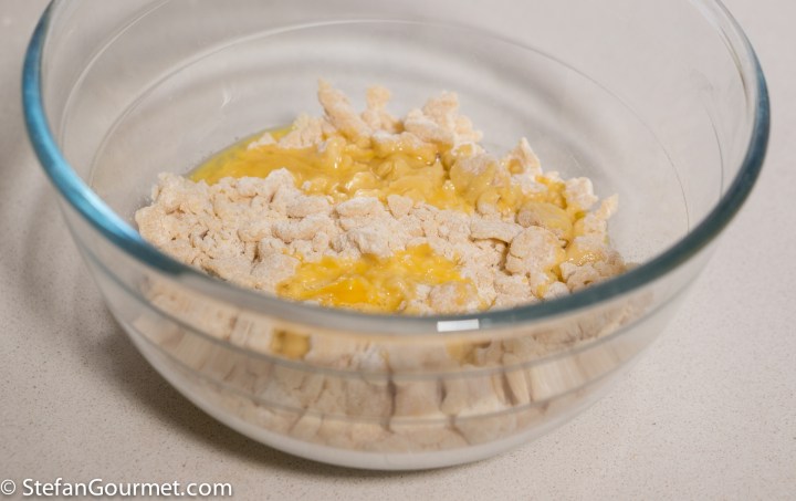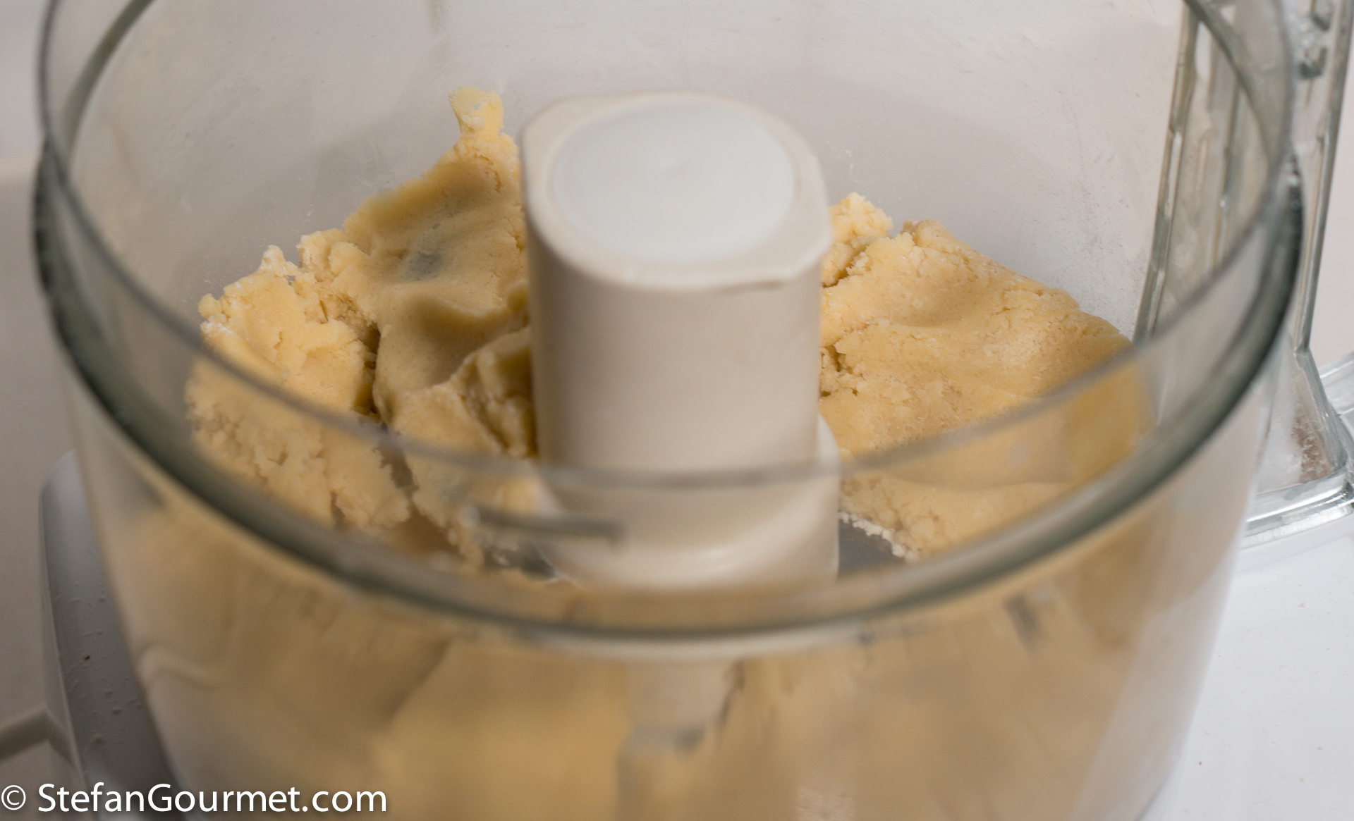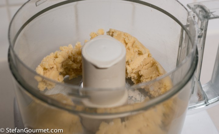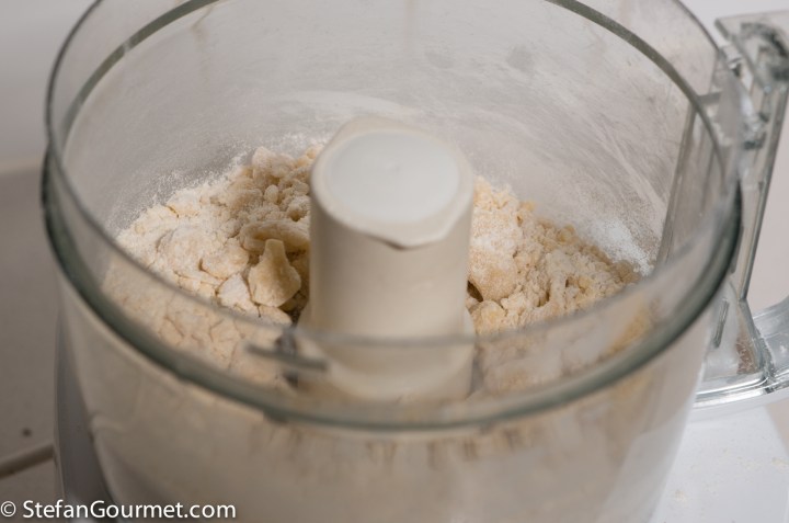Pulse a couple of times to end up with small clumps (pea sized) of dough that are surrounded with dry flour.