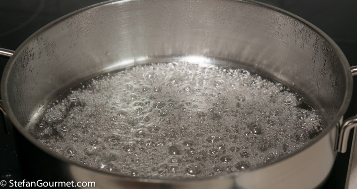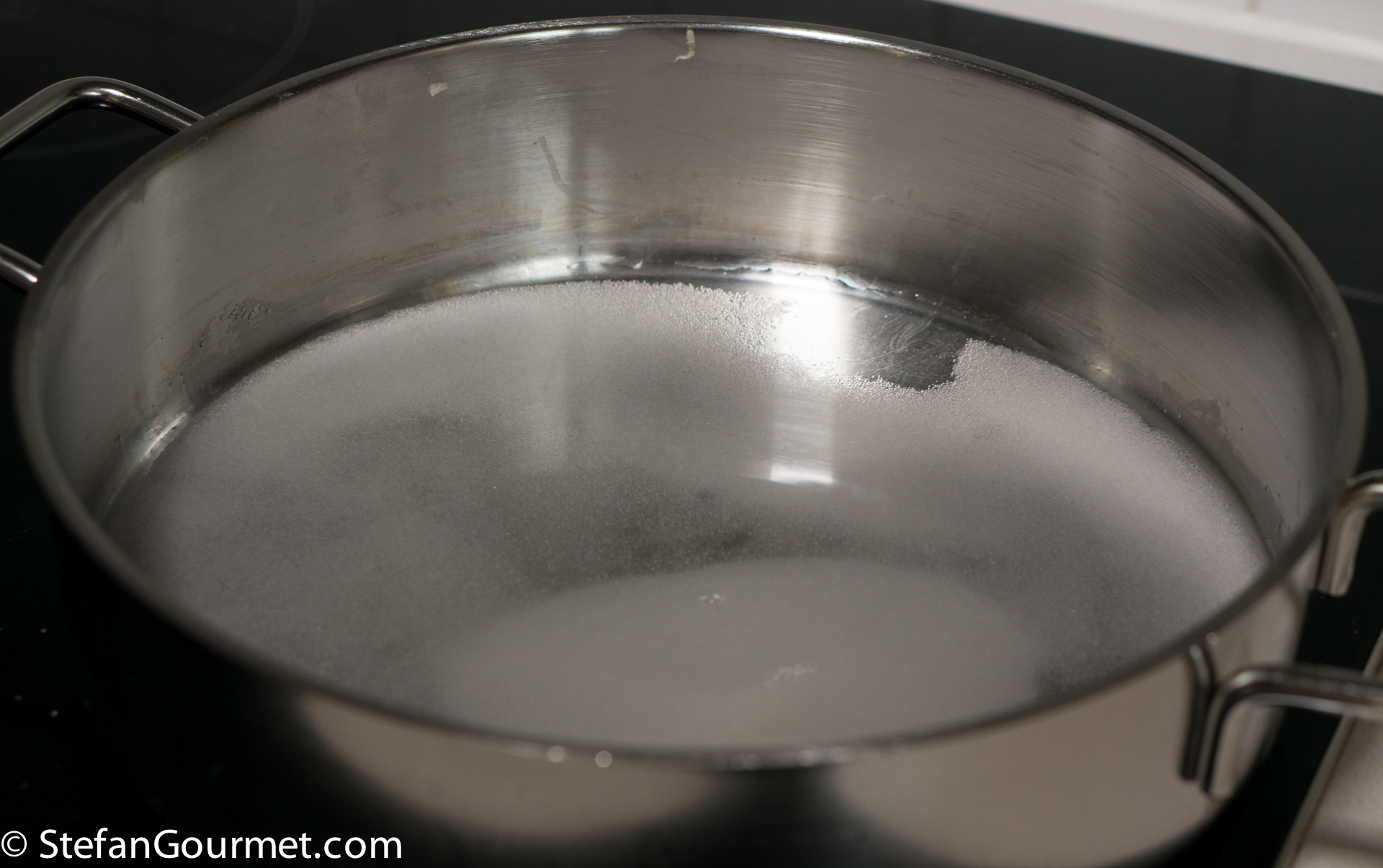 Combine 100 grams of sugar with 100 ml of water in a wide shallow pan with a diameter of 28 cm (11″).
