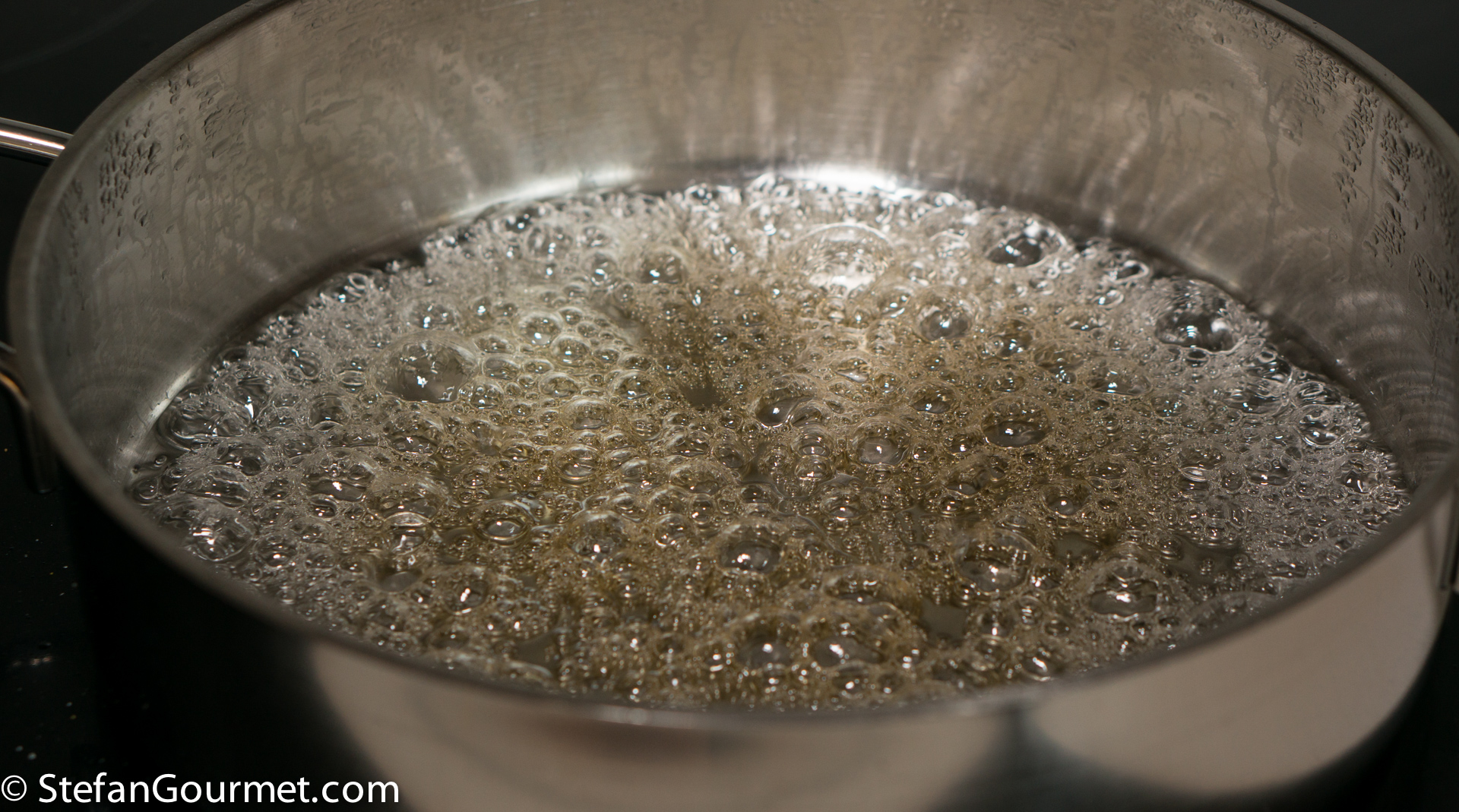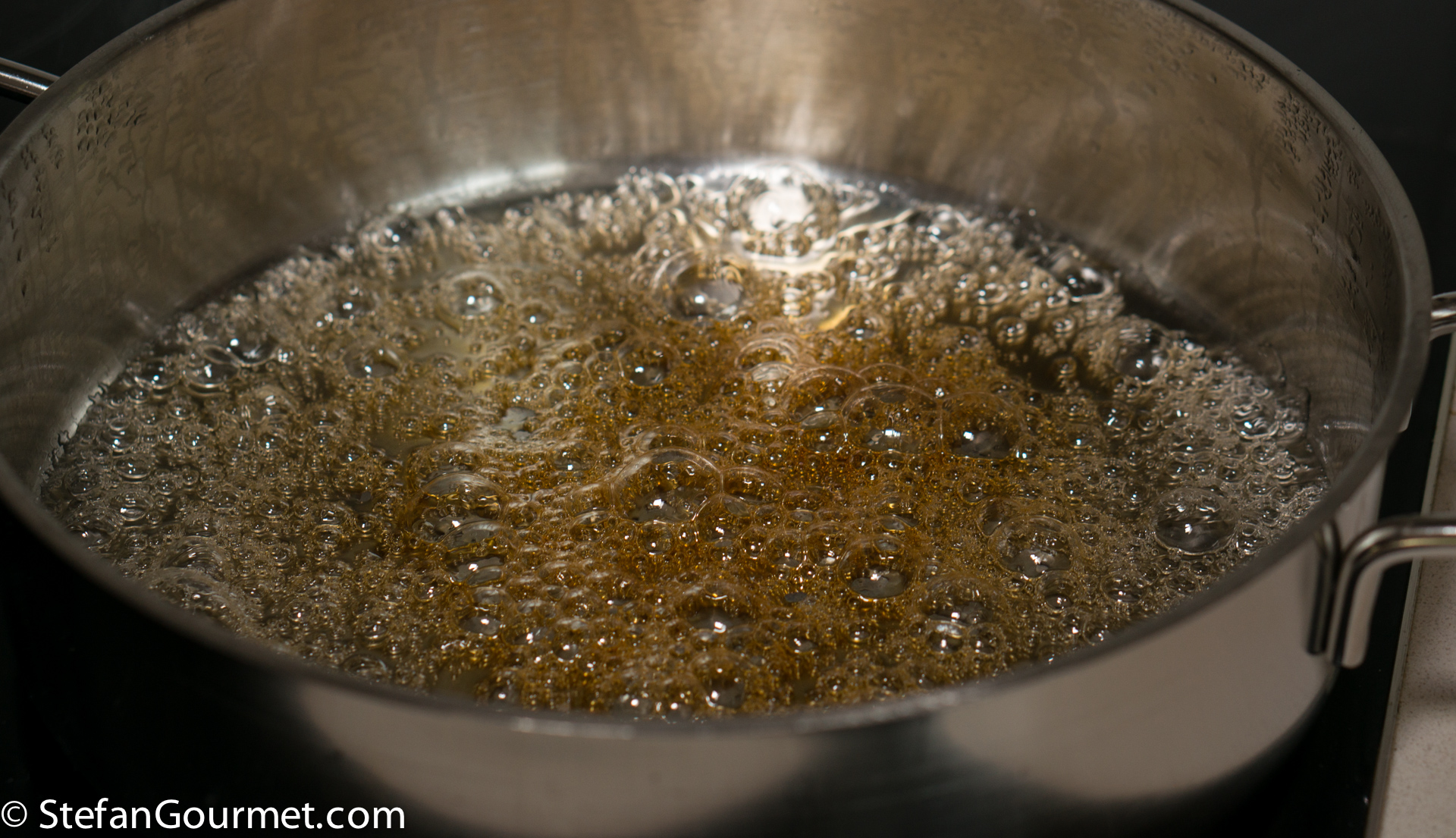 …but this is. It takes less time to go from yellow to brown to black than from white to yellow, so watch the caramel carefully.