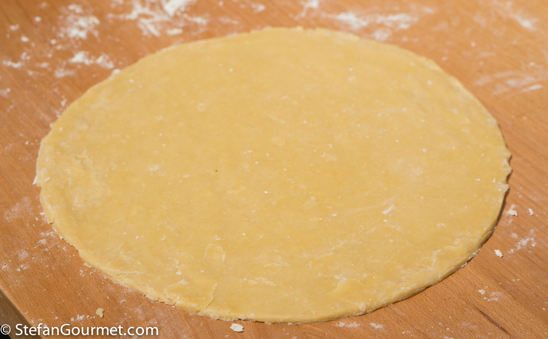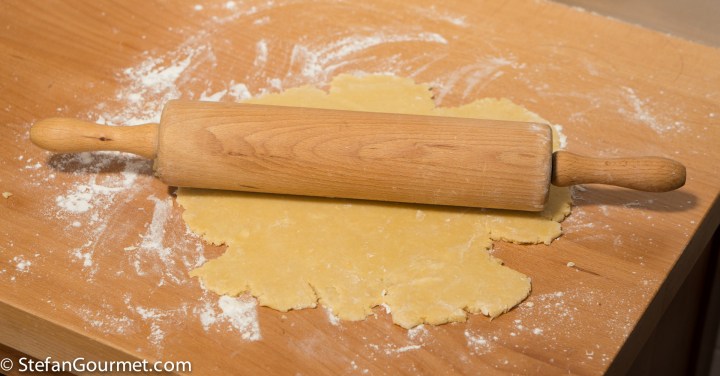 After half an hour of resting, take the dough out of the refrigerator. Roll it out on a floured work surface (a wooden surface is easiest) using a rolling pin. (I could have used half a tablespoon more water in the dough.)