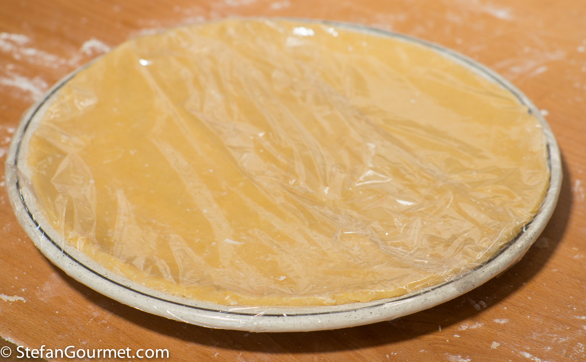 Place the circle of dough on a large flat plate, cover with cling film, and refrigerate until you are ready to bake.