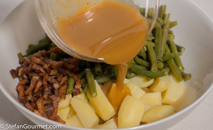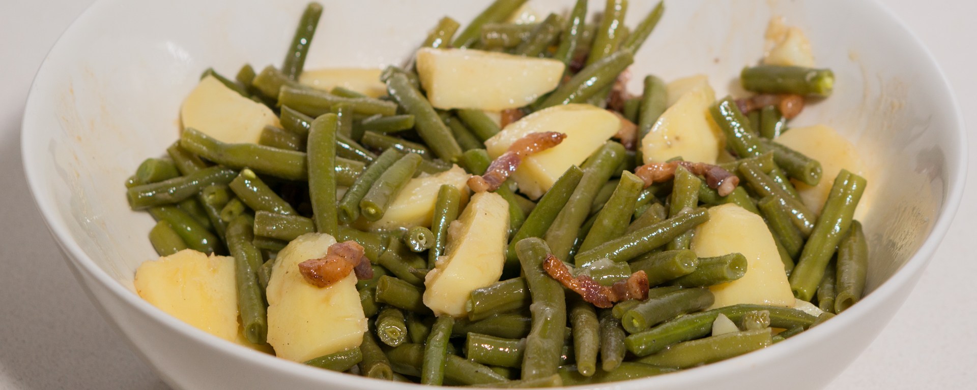 Combine the green beans, potatoes, and pancetta in a large bowl.