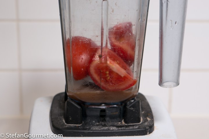 Once the beef has been cooked sous-vide, put the juices from the bag in a blender together with the tomato.