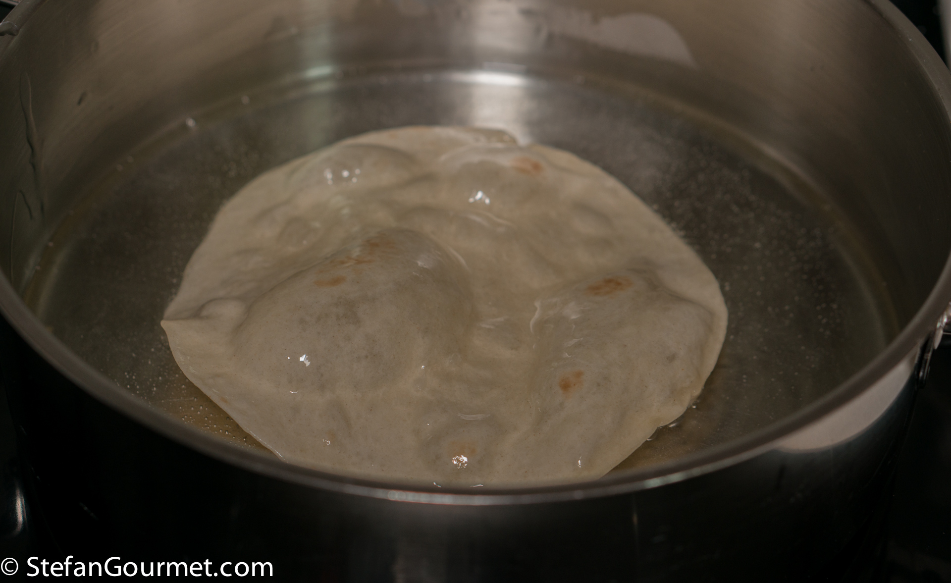 Allow the tortillas to drain on paper towels, and pat with paper towels to get rid of any excess oil.
