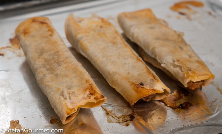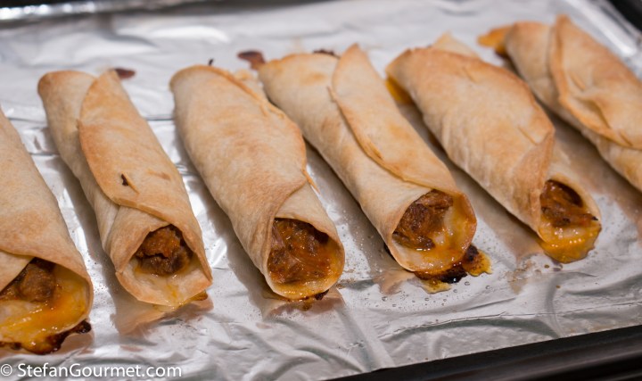 Line a baking sheet with aluminum foil or oven paper. Arrange the tortillas on the baking sheet and place 1/6 of the meat filling on each tortilla. Then roll them up, and secure with a tooth pick as shown.