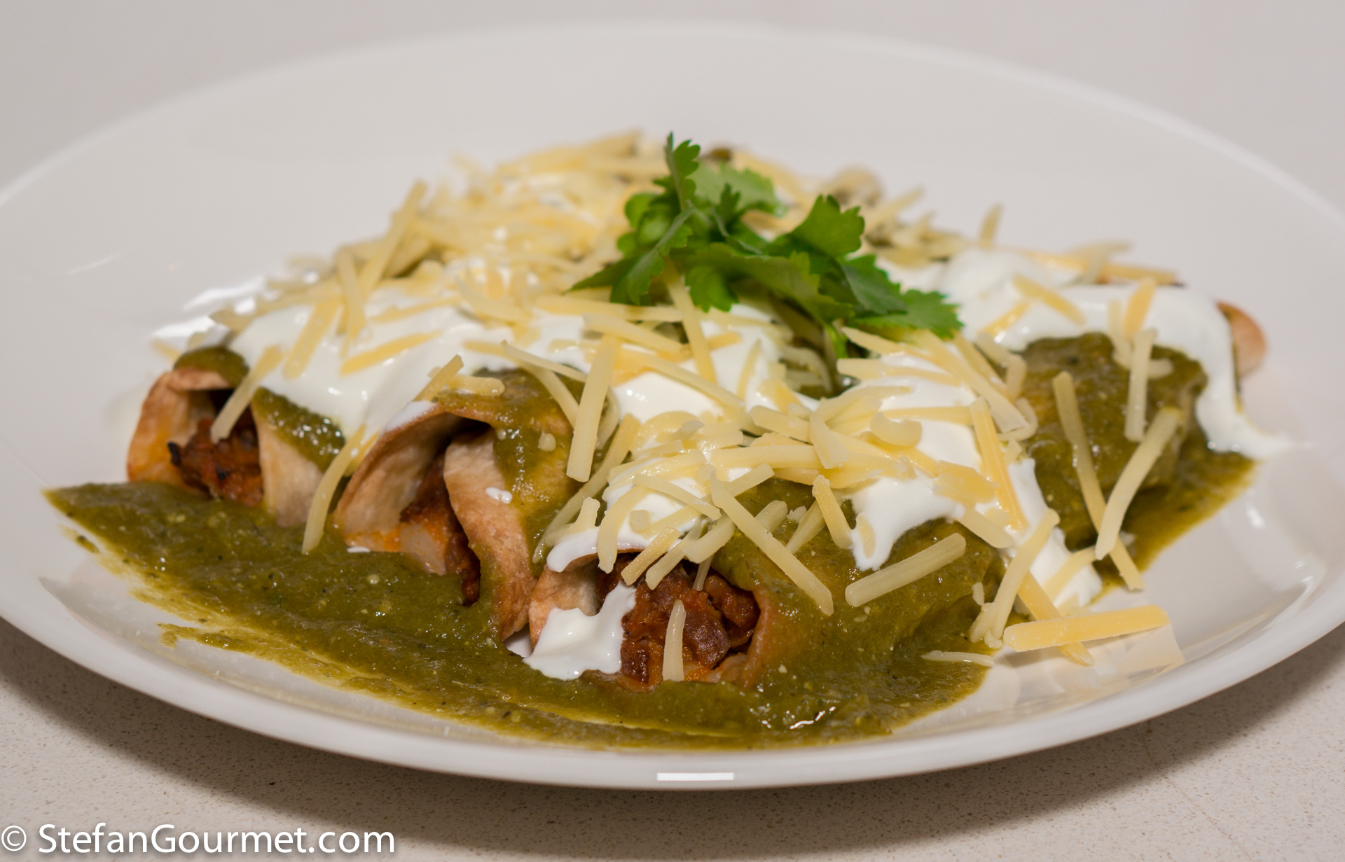As promised some recipes that use the salsa verde I posted about yesterday. These crispy green enchiladas are based on Baby Lady’s recipe, with beef instead of chicken. It was one of the best new dishes I’ve tried lately. The combination of the bright spicy green salsa with the sour cream, the beef, and the texture of the toasted tortillas was just wonderful. If you read Richard’s post about them, you can see that Sweetieman and Baby Lady did not agree whether these are called taquitos or enchiladas. I just know that they were delicious and that I have already made them again.